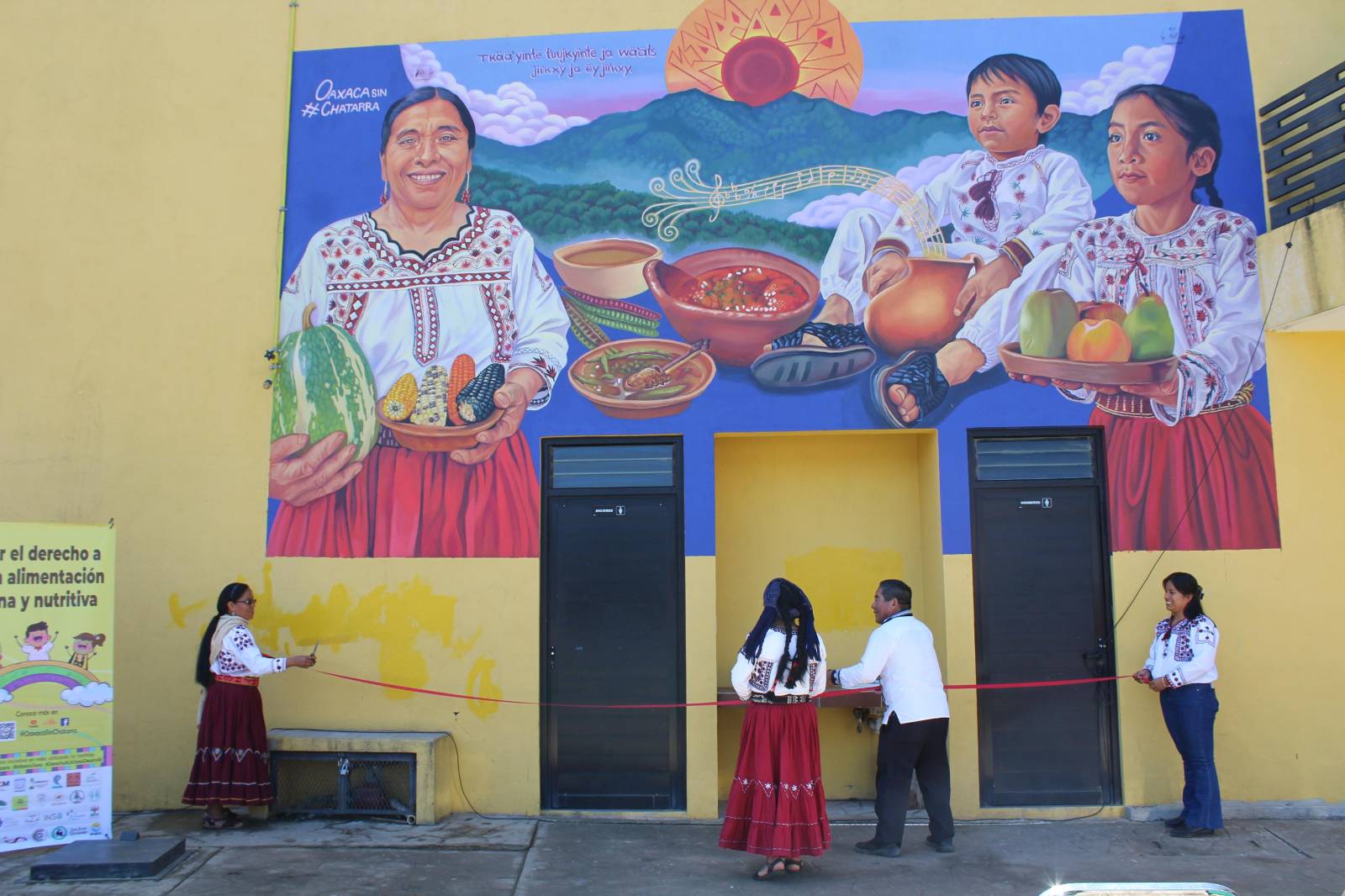 Oaxaca.-Este viernes, en el Comedor Comunitario de Santa María Tlahuitoltepec, Mixe, se llevó a cabo la develación del 20° mural Por el derecho a una alimentación sana y nutritiva, realizado en el marco de la campaña #OaxacasinChatarra como una expresión de la importancia de la alimentación tradicional que por generaciones han preservado nuestras abuelas y abuelos.