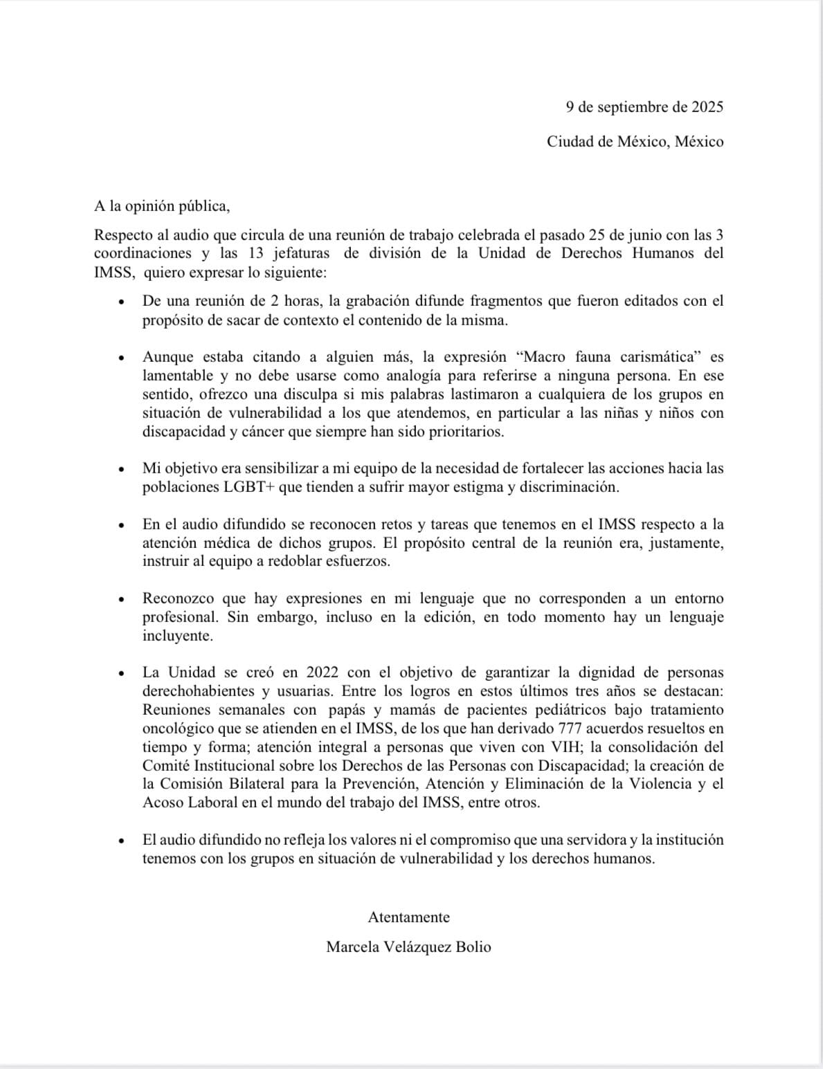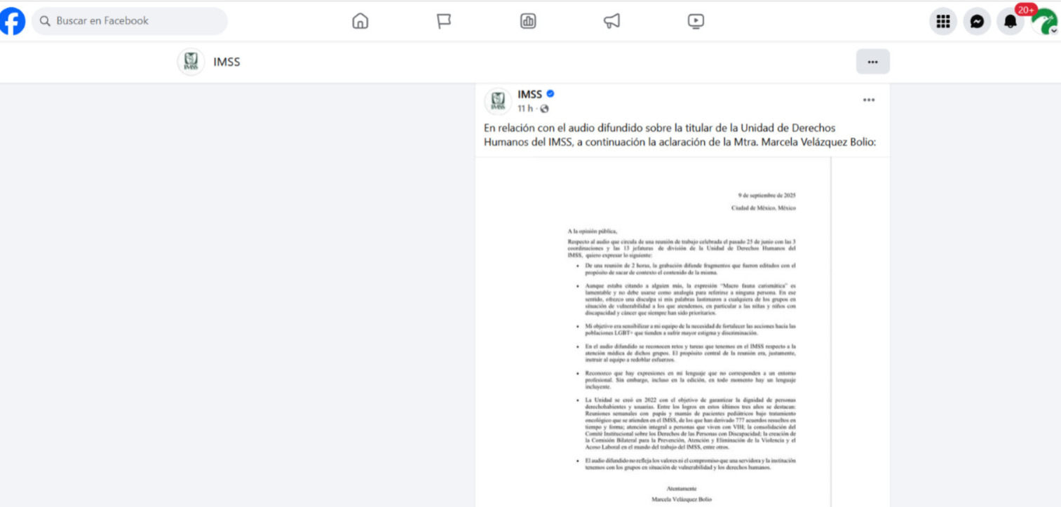 "En relación con el audio difundido sobre la titular de la Unidad de Derechos Humanos del IMSS, a continuación, la aclaración de la Mtra. Marcela Velázquez Bolio". El texcto se lee en un hoja en blanco sin logo institucional.