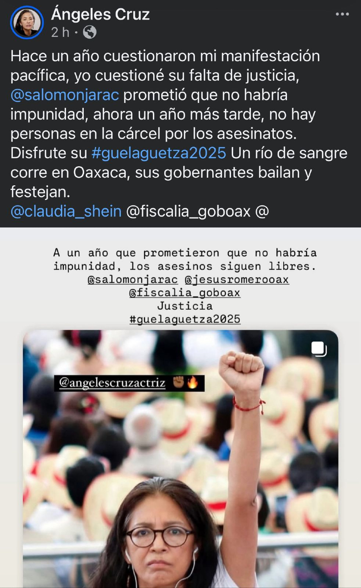 Tras de haber realizado una protesta pacífica  -con una pancarta y el puño en alto,  desde la gradería  del auditorio donde se realizaba la edición matutina de la Guelagueteza del año pasado, la galardonada actriz, a distancia, posteó este lunes esa imagen para demandar  nuevamente avances en las investigaciones que  den con los responsables que  le quitaron la vida a su hermano, quien se desempeñaba como autoridad de la comunidad de Guadalupe Victoria, en la region de la mixteca.