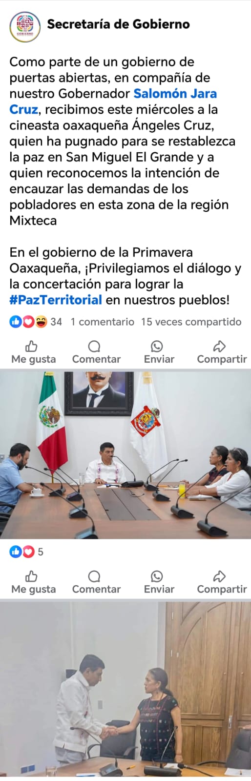 "Como parte de un gobierno de puertas abiertas, en compañía de nuestro Gobernador Salomón Jara Cruz, recibimos este miércoles a la cineasta oaxaqueña Ángeles Cruz, quien ha pugnado para se restablezca la paz en San Miguel El Grande y a quien reconocemos la intención de encauzar las demandas de los pobladores en esta zona de la región Mixteca