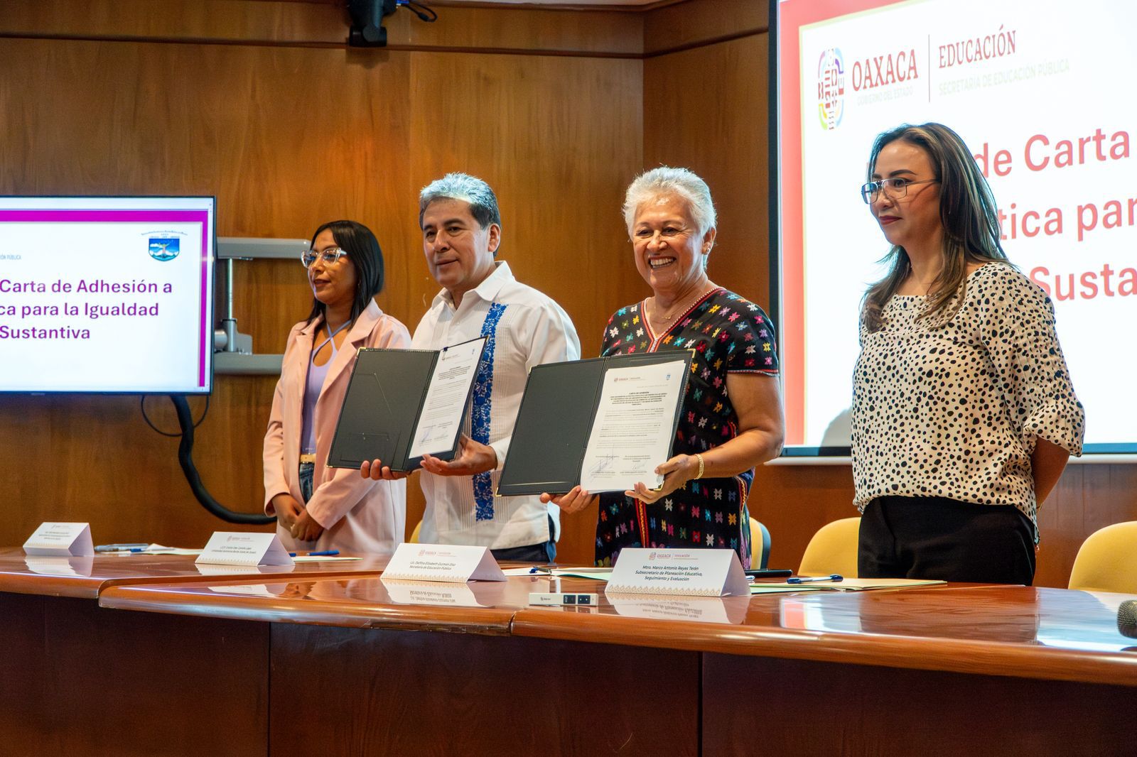 Durante la actividad encabezada por la titular de la SEP, Delfina Guzmán Díaz; se suscribió la Carta de Adhesión, que se compromete a la universidad a participar activamente en la implementación de acciones e iniciativas orientadas a garantizar la inclusión, equidad y respeto a los derechos humanos en el ámbito educativo, de acuerdo con esta política pública promovida por el Gobierno de Oaxaca.