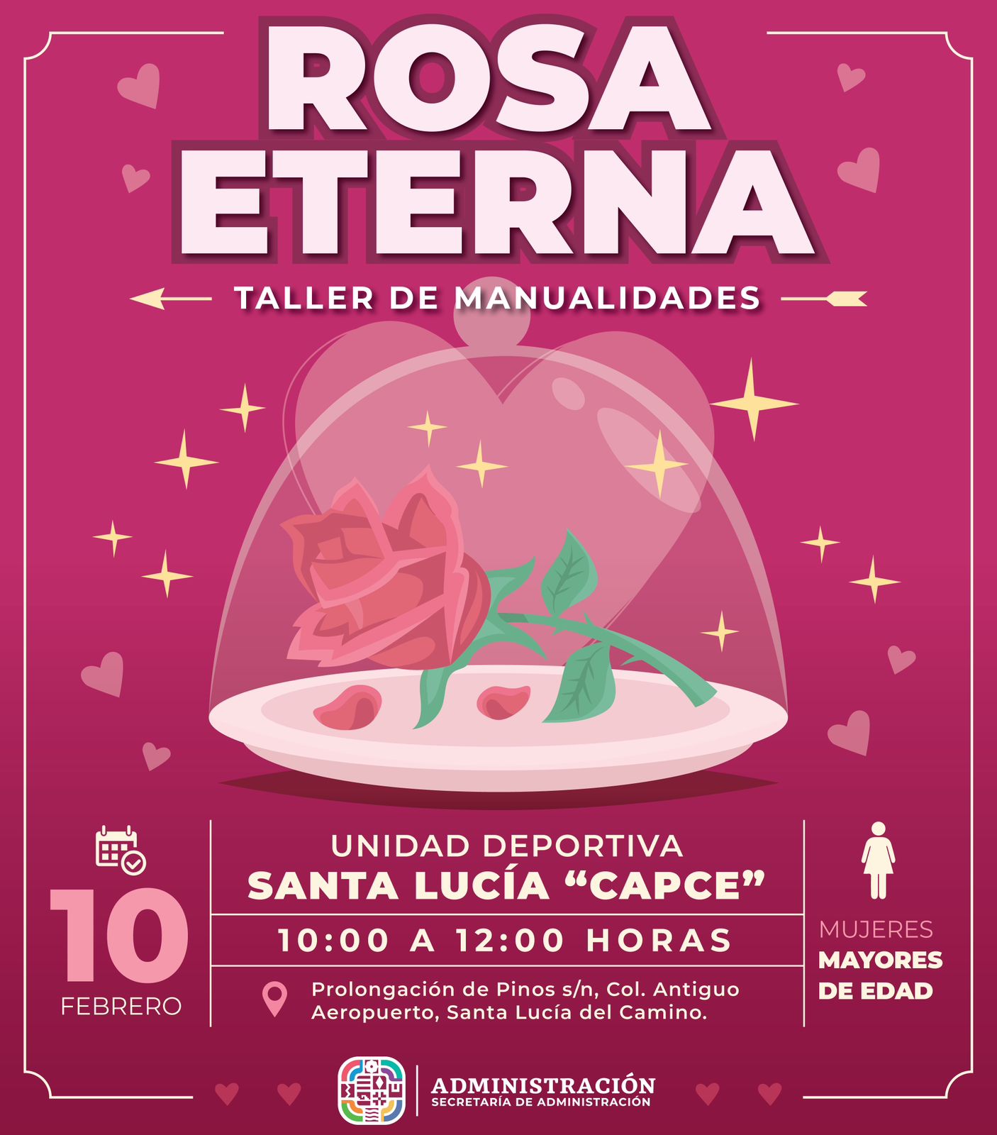 El sábado 10 de febrero, en la Unidad Deportiva Santa Lucía Capce a las 12:00 horas, mujeres adultas están invitadas a unirse al taller de manualidades Rosa Eterna; mientras que en el parque de Convivencia Infantil Luis Donaldo Colosio Murrieta, a las 13:00 horas, se realizará el taller Elaboración de tarjetas para el Día del Amor y la Amistad, dirigido a niñas y niños de 6 a 10 años.