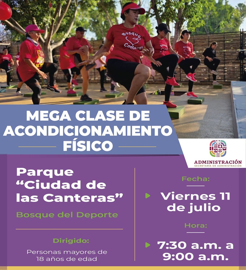 El 11 de julio se ofrecerá una Mega Clase de Acondicionamiento Físico en el Parque Ciudad de las Canteras, Bosque del Deporte, de 07:30 a 09:00 horas, dirigida a personas mayores de 18 años.