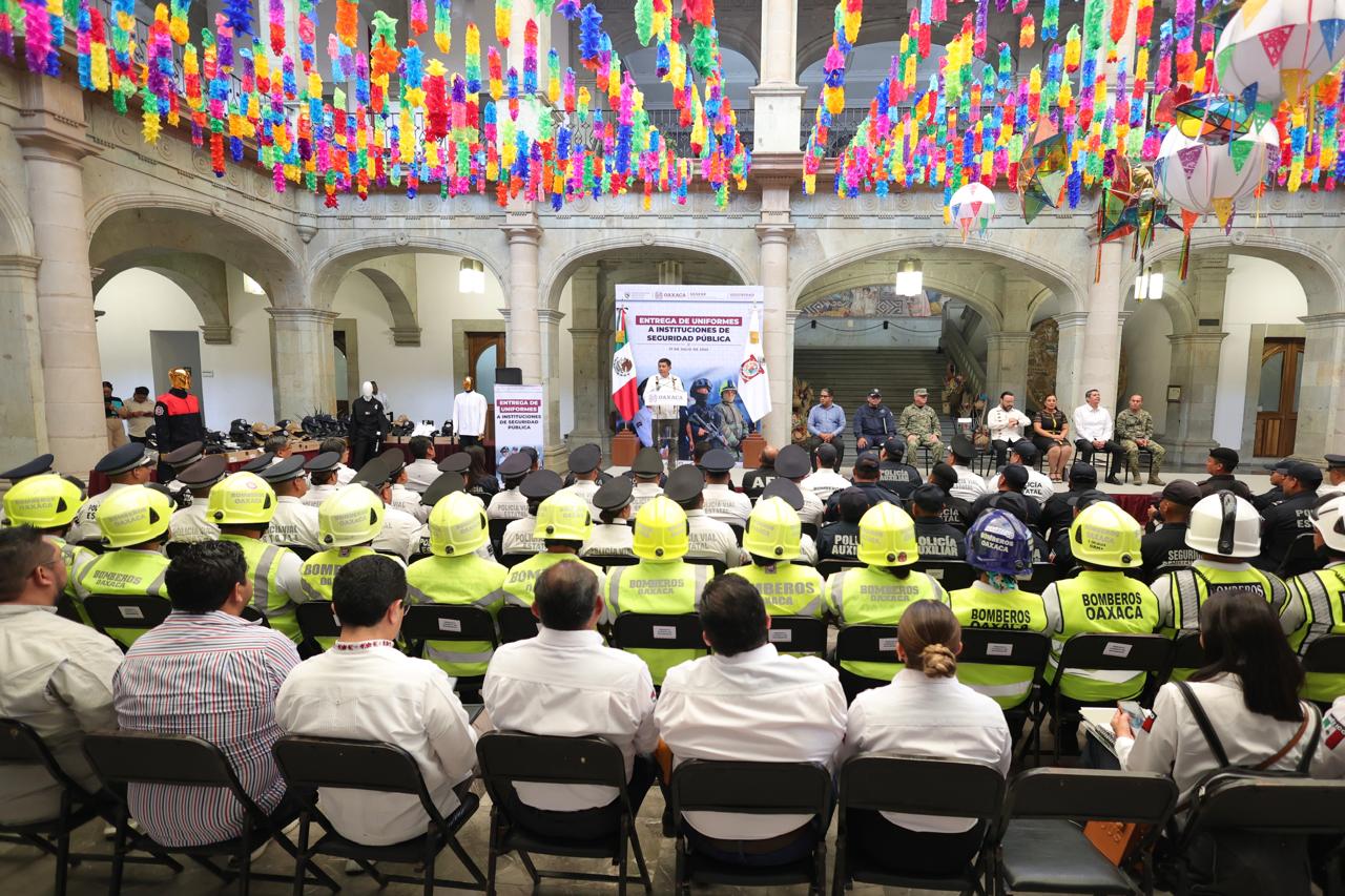 Oaxaca de Juárez, Oax.- Con el firme objetivo de resarcir la deuda histórica y dignificar a las diferentes instituciones de seguridad pública del estado, el Gobernador Salomón Jara Cruz entregó paquetes de uniformes y equipos tácticos nuevos a 6 mil 627 elementos, que requirieron 49.8 millones de pesos en coinversión con el Gobierno Federal.
