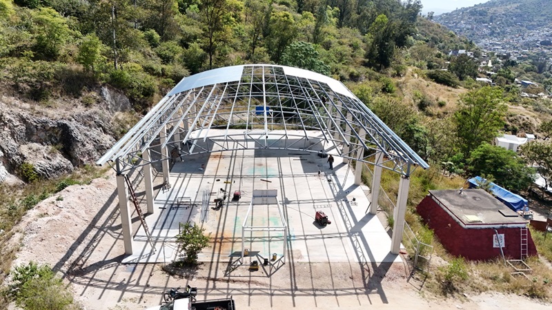 El titular de la dependencia, Carlos Vichido Hernández informó que se trabaja en 666.54 metros cuadrados, donde se han cimentado columnas de concreto e instalado estructura de acero y se avanza en la colocación de la cubierta, para posteriormente, instalar el sistema de drenaje pluvial.
