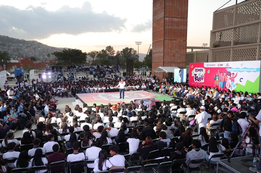 Oaxaca .- Cerca de mil 500 adolescentes participaron junto al Gobernador Salomón Jara Cruz y la Presidenta Honoraria del Sistema para el Desarrollo Integral de la Familia (DIF) Oaxaca, Irma Bolaños Quijano en la feria de la campaña Rompe el Tabú, hazlo seguro; encaminada a orientarles sobre sus derechos sexuales y reproductivos.