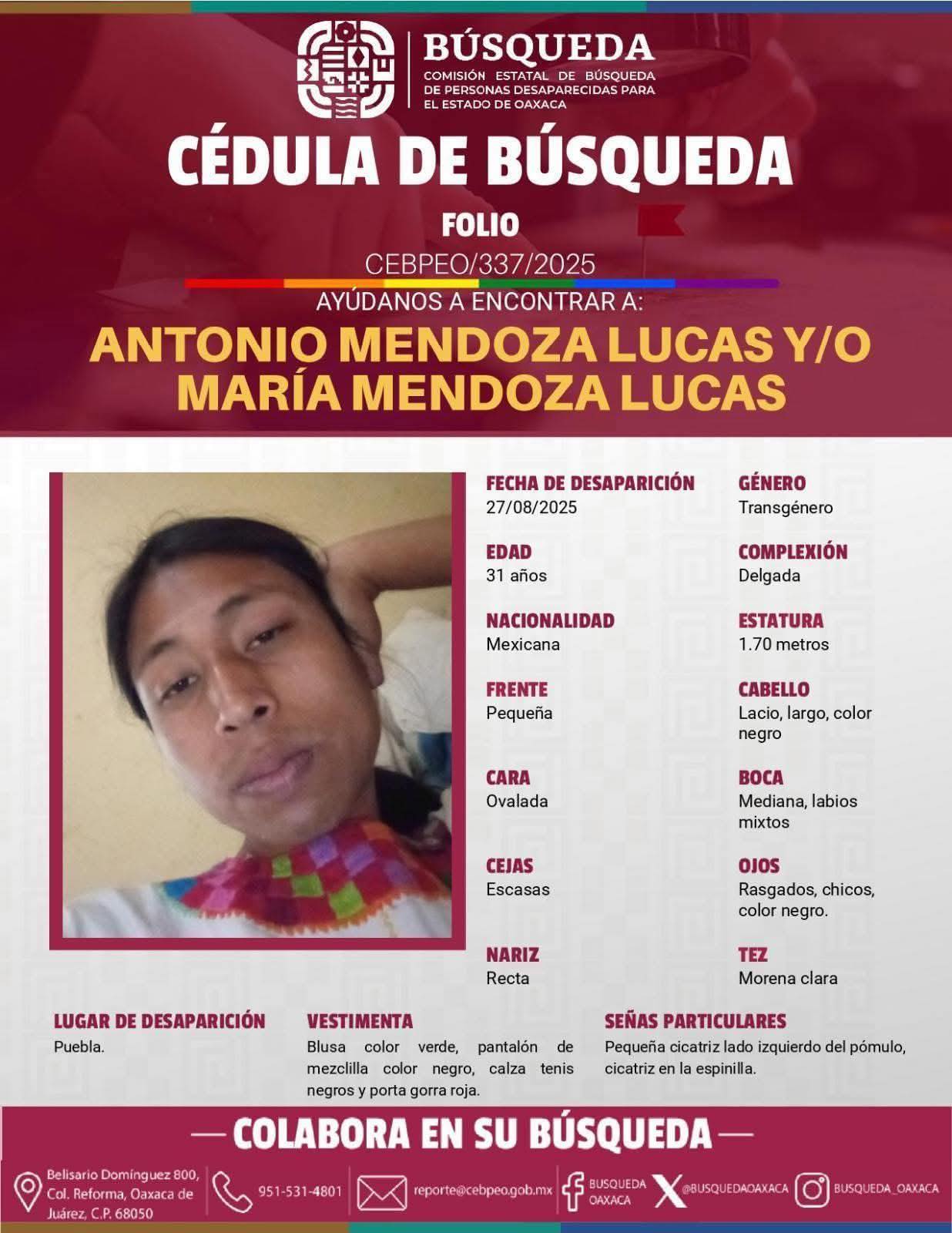 Esta acción, que se percibe solidaria, obedece a que la Comisión Estatal de Búsqueda de Personas Desaparecidas (CLB) y el Sistema de Transporte Colectivo Metropolitano BinniBus han unido esfuerzos para localizar a Antonio Mendoza Lucas, también conocido como María Mendoza Lucas, miembro de la comunidad LGBTI+.