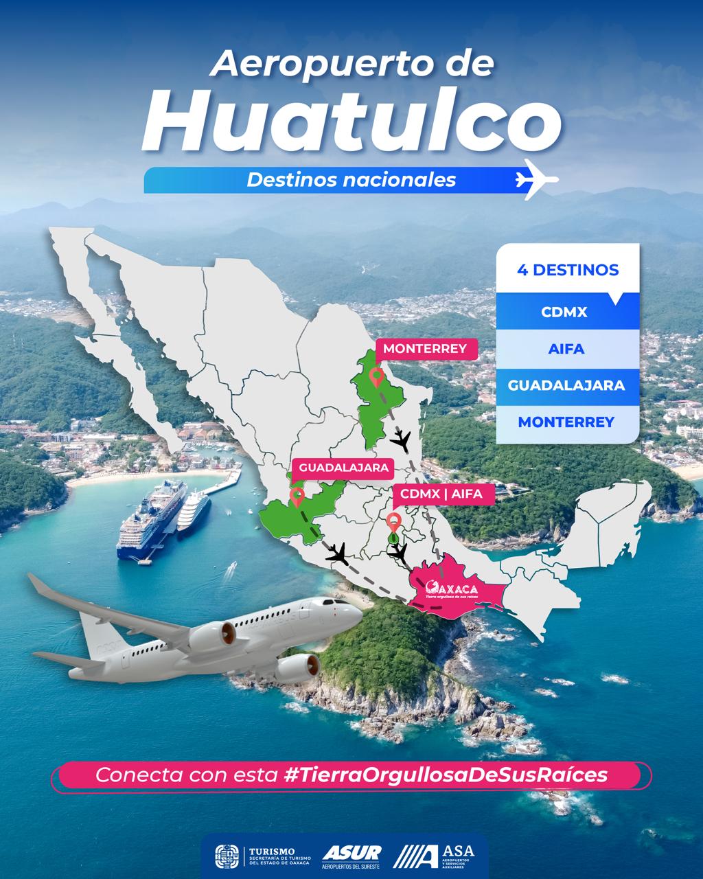 Recordó que, Huatulco cuenta con vuelos que lo conectan con el Aeropuerto Internacional de la Ciudad de México (AICM) y con el Aeropuerto Internacional Felipe Ángeles (AIFA), lo que facilita la llegada de visitantes provenientes del valle de México, así como internacionales que arriban a estas dos principales terminales del país.