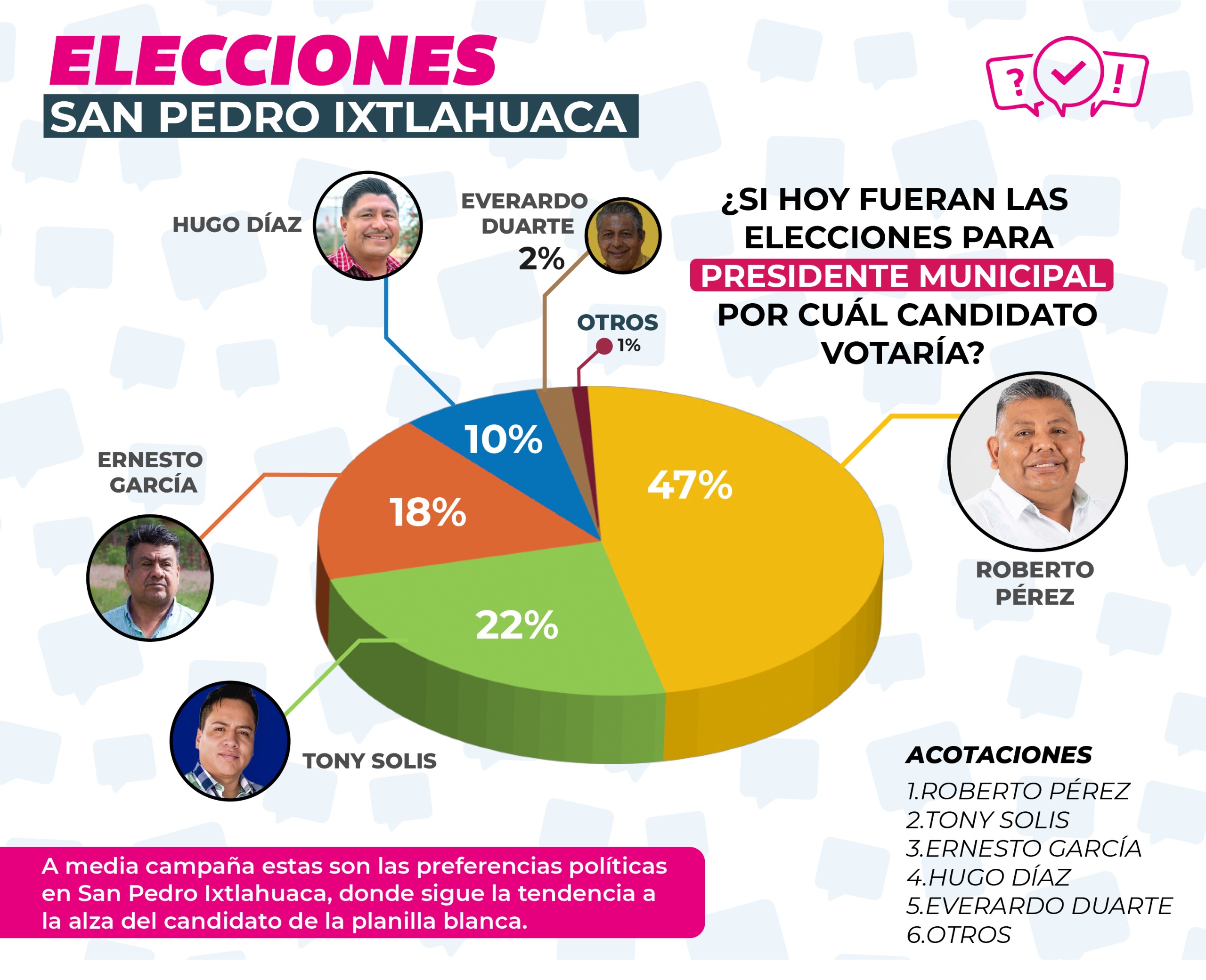 San Pedro Ixtlahuaca, Oax.. A tan solo una semana de llevarse a cabo las elecciones en este municipio, el candidato de la Planilla Blanca, Roberto Pérez Delgado, se consolida con una ventaja irreversible dejando atrás a sus contrincantes según la opinión ciudadana recabada en una última encuesta.