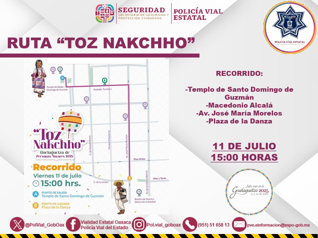 Señaló que este viernes se brindará acompañamiento vial a la calenda tradicional de la Guelaguetza de Personas Mayores "Toz Nakchho" que partirá a las 15:00 horas, del templo de Santo Domingo de Guzmán.