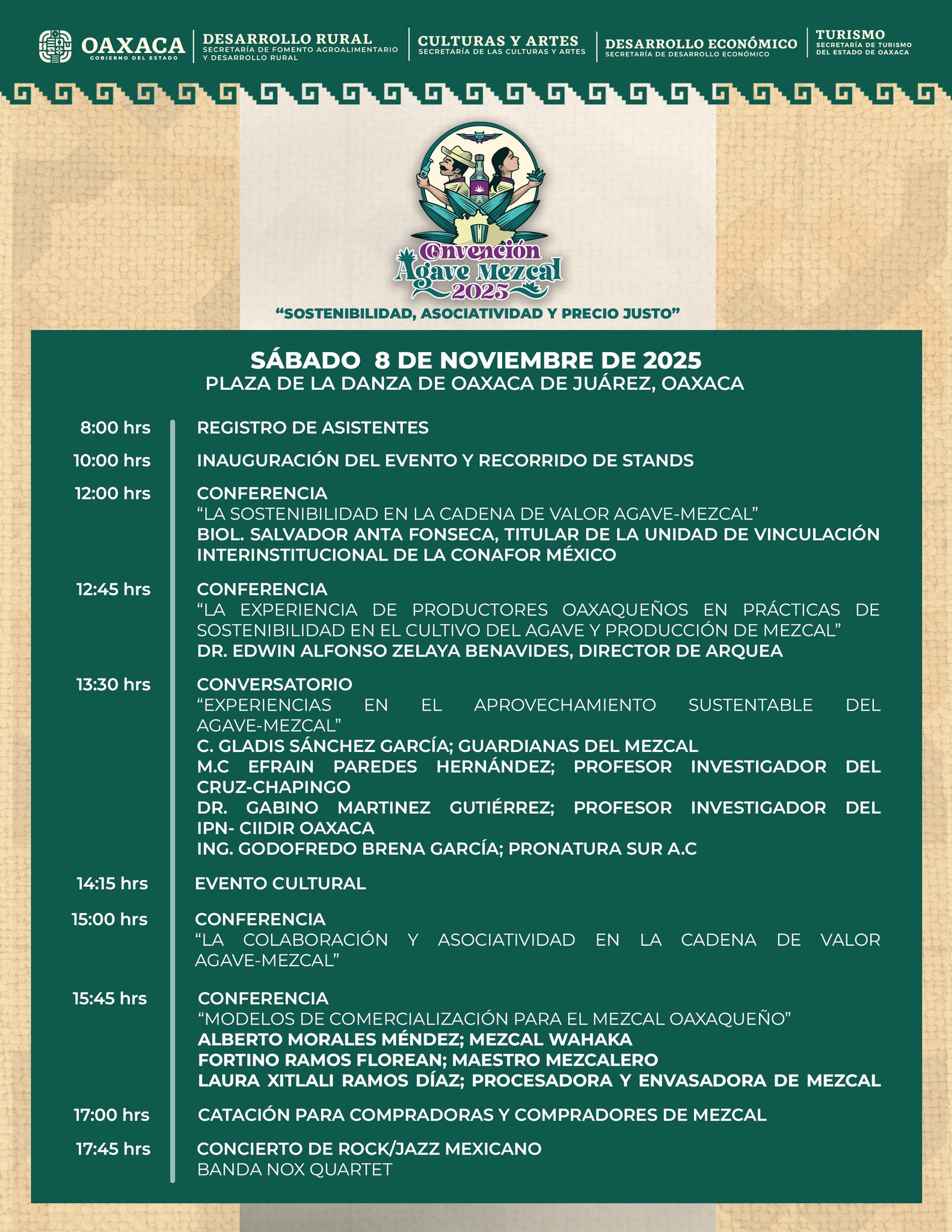 Bajo el lema “Sostenibilidad, asociatividad y precio justo”, el encuentro reunirá a personas productoras, especialistas, académicas, maestras y maestros mezcaleros, así como representantes de los sectores agroalimentario, cultural y económico.