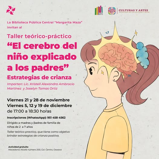 La Biblioteca Pública Central "Margarita Maza" invita al taller teórico-práctico "El cerebro del niño y la niña explicado a los padres y madres", estrategias de crianza dirigido a padres y madres de familia de niños de 2 a 7 años, impartido por la Lic. Kristell Alexandra Ambrocio Martínez y Joselyn Tomas Ortiz.
