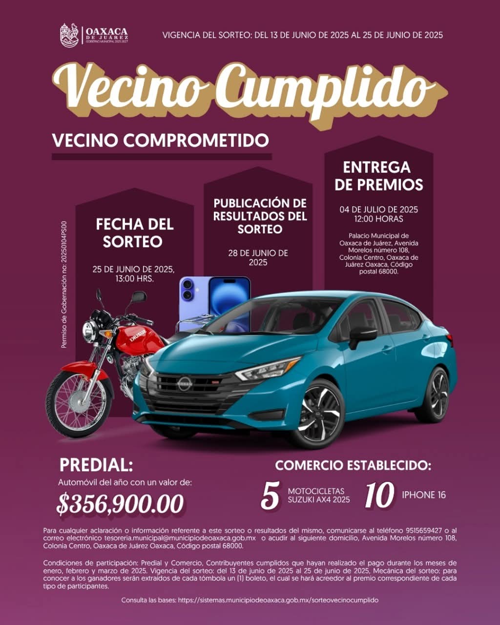Este ejercicio se lleva a cabo con el permiso correspondiente de la Secretaría de Gobernación y busca fortalecer la cultura del cumplimiento, reconociendo públicamente a quienes contribuyen al desarrollo y funcionamiento del municipio. Para consultar los resultados y obtener mayor información, las personas interesadas pueden ingresar al sitio oficial: https://sistemas.municipiodeoaxaca.gob.mx/sorteovecinocumplido