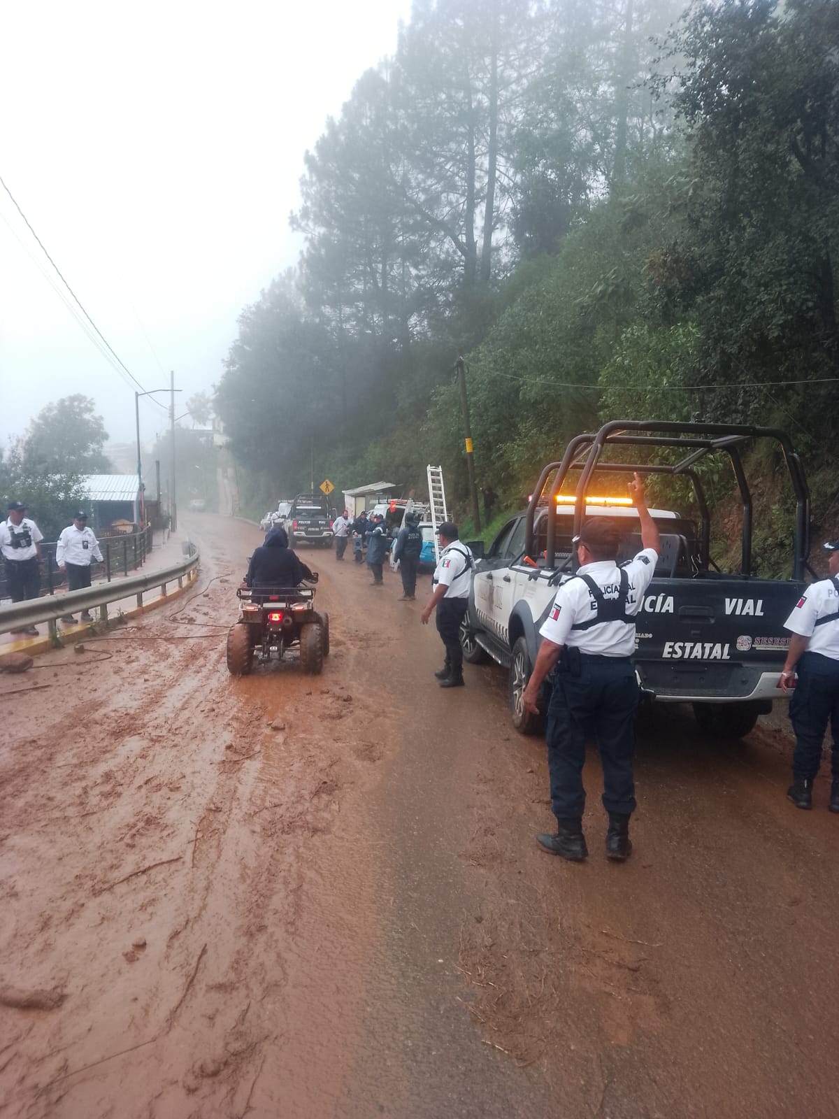De manera paralela, elementos de la corporación estatal despliegan el Plan de Atención Vial de Emergencias (AVE) en la carretera federal 175, particularmente en el tramo Oaxaca–Miahuatlán-Candelaria Loxicha, donde se registró un deslave a la altura del kilómetro 185.