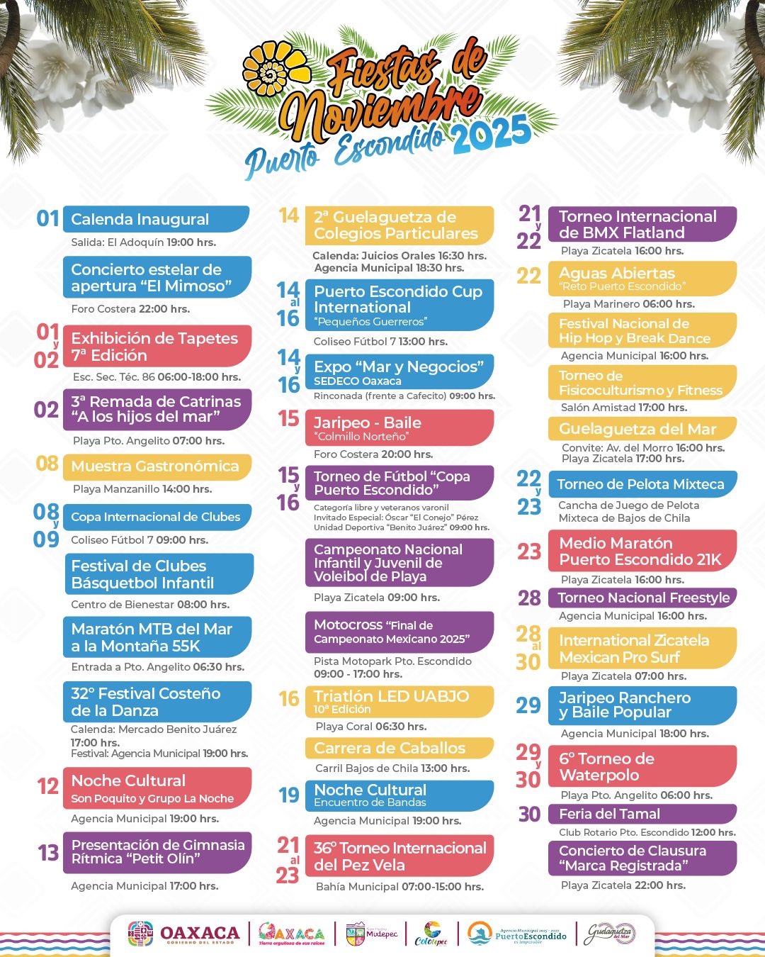 En presencia de autoridades municipales, personas organizadoras y representantes de prestadoras y prestadores de servicios turísticos; la funcionaria resaltó que el Gobierno de Oaxaca trabajó coordinadamente para integrar una cartelera con más de 42 actividades, entre estas: conciertos con más de 14 agrupaciones, muestras gastronómicas y exposiciones.