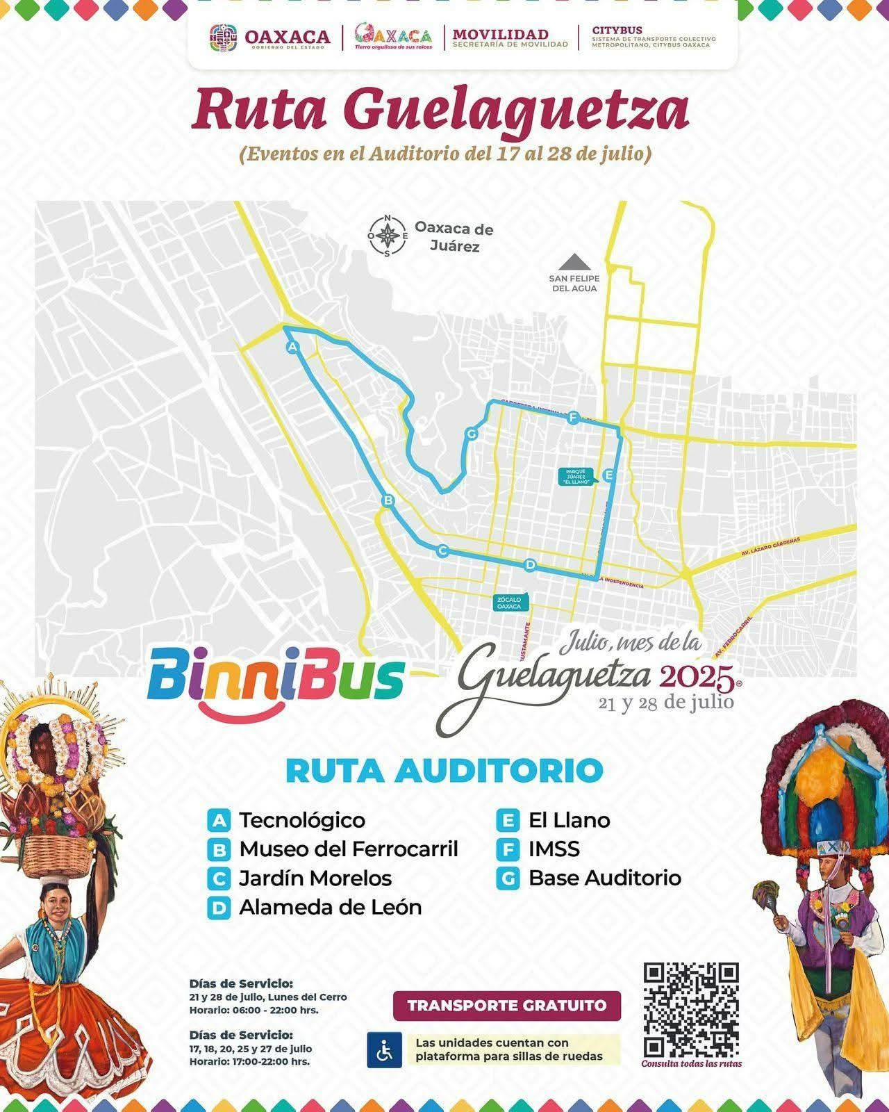 Mediante la Ruta Auditorio, que partirá del Instituto Tecnológico de Oaxaca (ITO), el Museo del Ferrocarril, Alameda de León y Paseo Juárez El Llano; se transportará a las personas a los Lunes del Cerro, al Bani Stui Gulal, y Donají la Leyenda. Durante el 21 y 28 de julio, el servicio será de 6:00 a 22:00 horas, y los días 17, 18, 20, 25 y 27 de 17:00 a 22:00 horas.