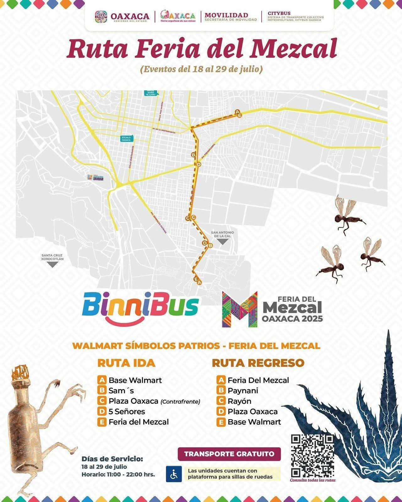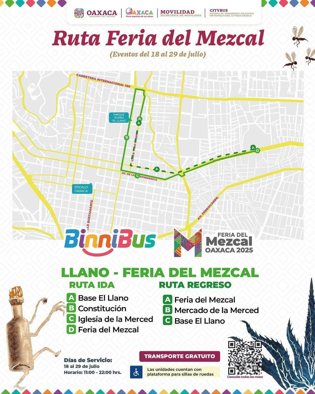 Como parte de la Ruta del Mezcal se habilitarán salidas en: Alameda de León, Paseo Juárez El Llano, Plaza Bella, Walmart Símbolos Patrios y el ITO; con destino hacia el Centro Cultural y de Convenciones de Oaxaca (CCCO), del 18 al 29 de julio en un horario de 11:00 a 22:00 horas.