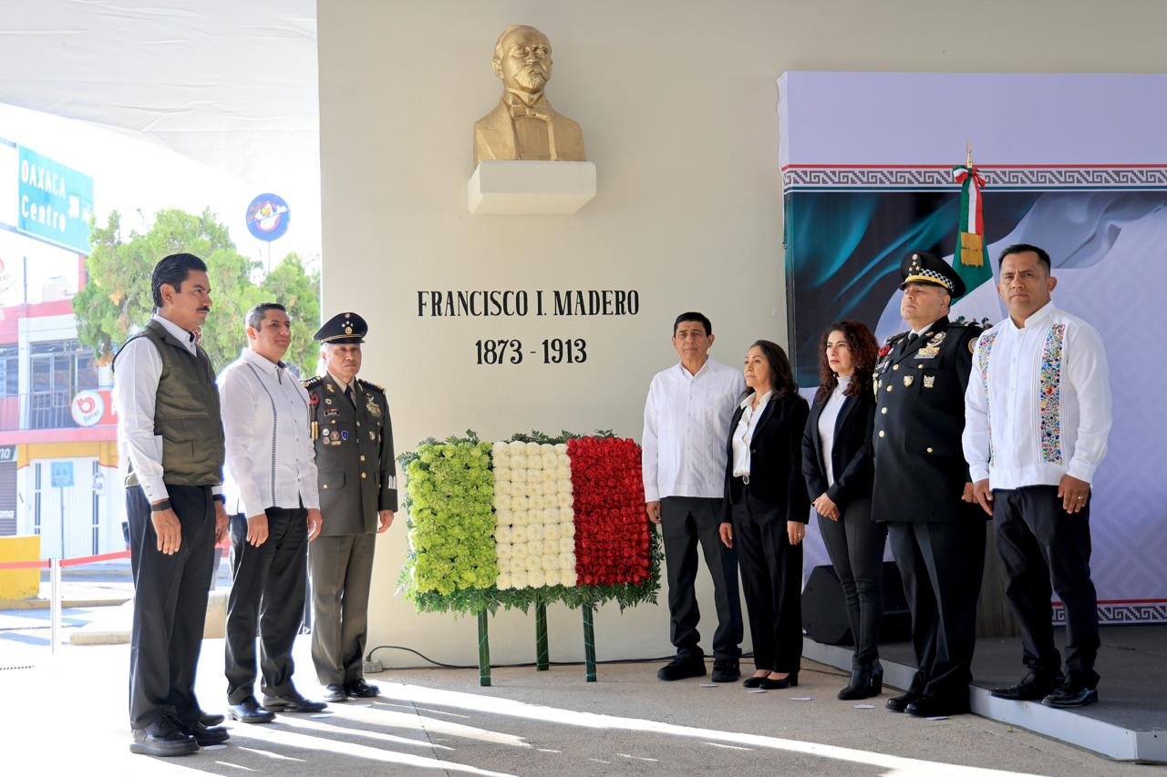 Durante el acto cívico realizado en el Jardín Madero de la capital del estado, al que también asistió la Presidenta Honoraria del Sistema DIF Oaxaca, Irma Bolaños Quijano; el Mandatario estatal expresó que su administración fundamenta su fuerza política y moral en los valores revolucionarios de caudillos como Francisco I. Madero, Emiliano Zapata y Venustiano Carranza; quienes sentaron las bases de un país más justo e incluyente.
