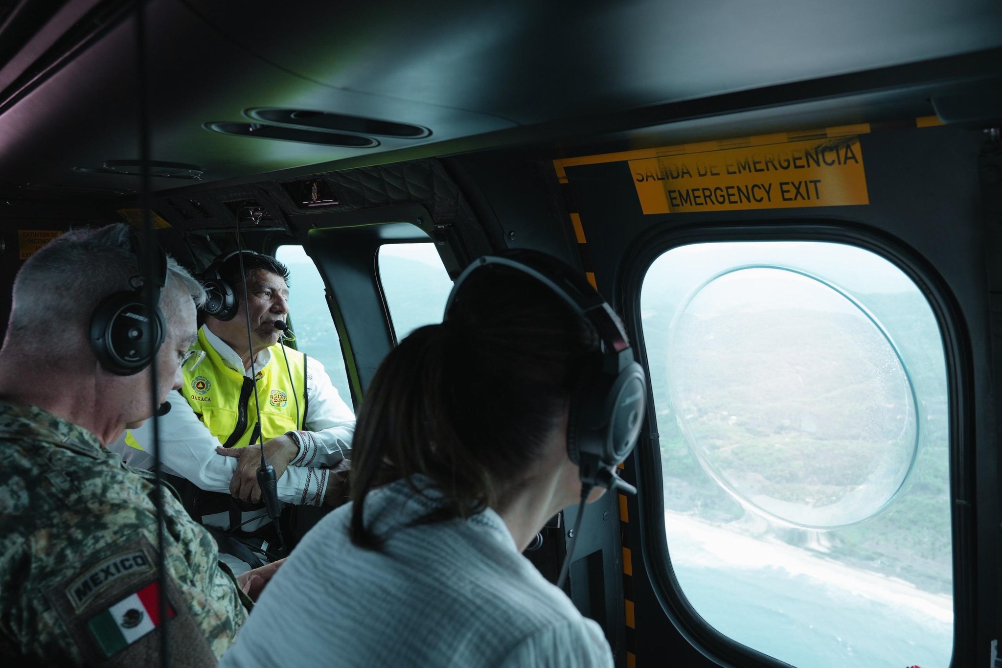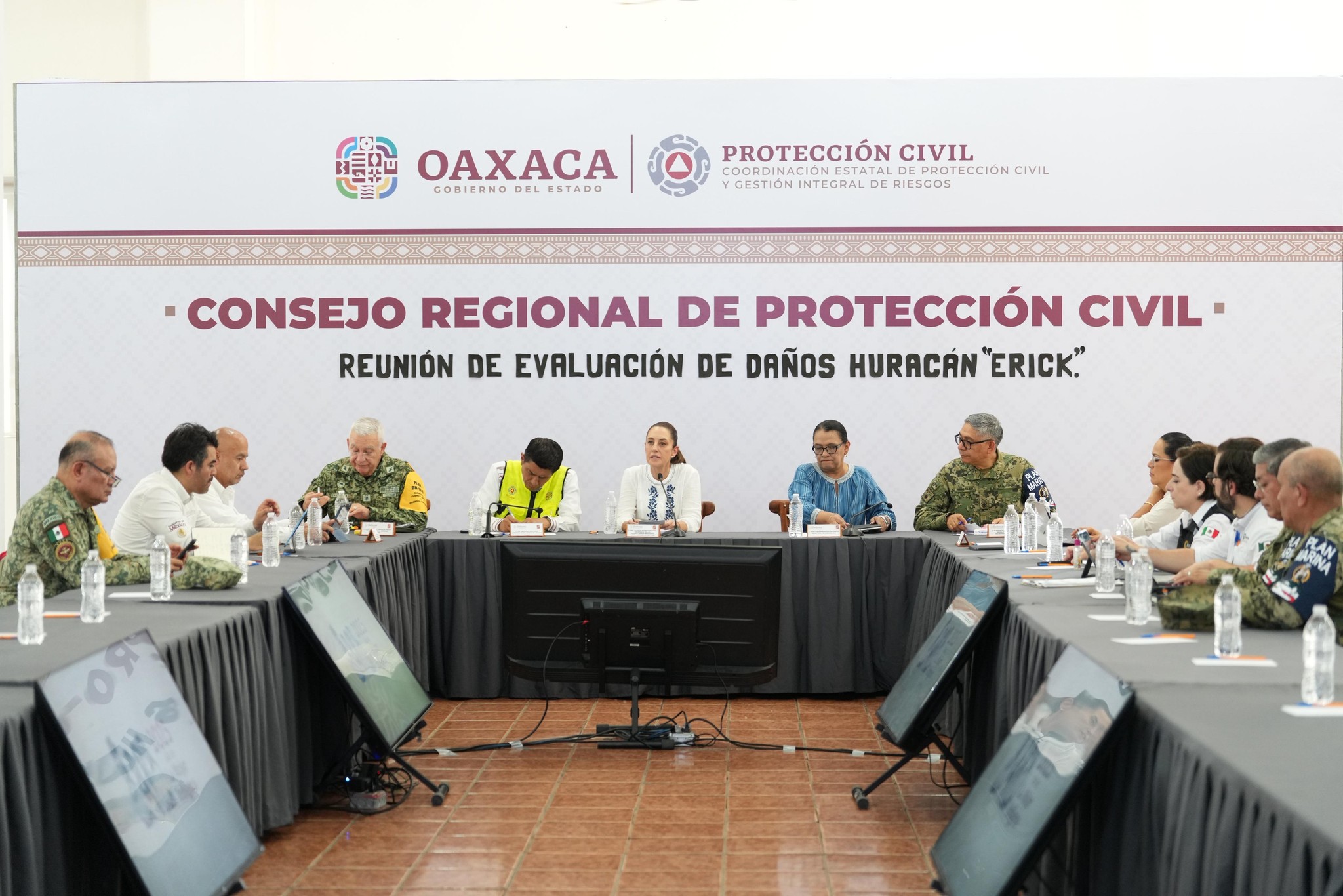 Acompañaron a la Presidenta de México, la secretaria de Gobernación, Rosa Icela Rodríguez Vázquez; el gobernador de Oaxaca, Salomón Jara Cruz; el secretario de Defensa Nacional, general Ricardo Trevilla Trejo; el secretario de Marina, almirante Raymundo Pedro Morales Ángeles; el secretario de Infraestructura, Comunicaciones y Transportes, Jesús Antonio Esteva Medina; la secretaria de Bienestar, Ariadna Montiel Reyes; el secretario de Salud, David Kershenobich Stalnikowitz; la coordinadora general de Asuntos Intergubernamentales y Participación Social de la Presidencia de la República, Leticia Ramírez Amaya; la coordinadora nacional de Protección Civil, Laura Velázquez Alzúa; el director general de la Comisión Nacional del Agua (Conagua), Efraín Morales López; y el director general del IMSS Bienestar, Alejandro Svarch Pérez.