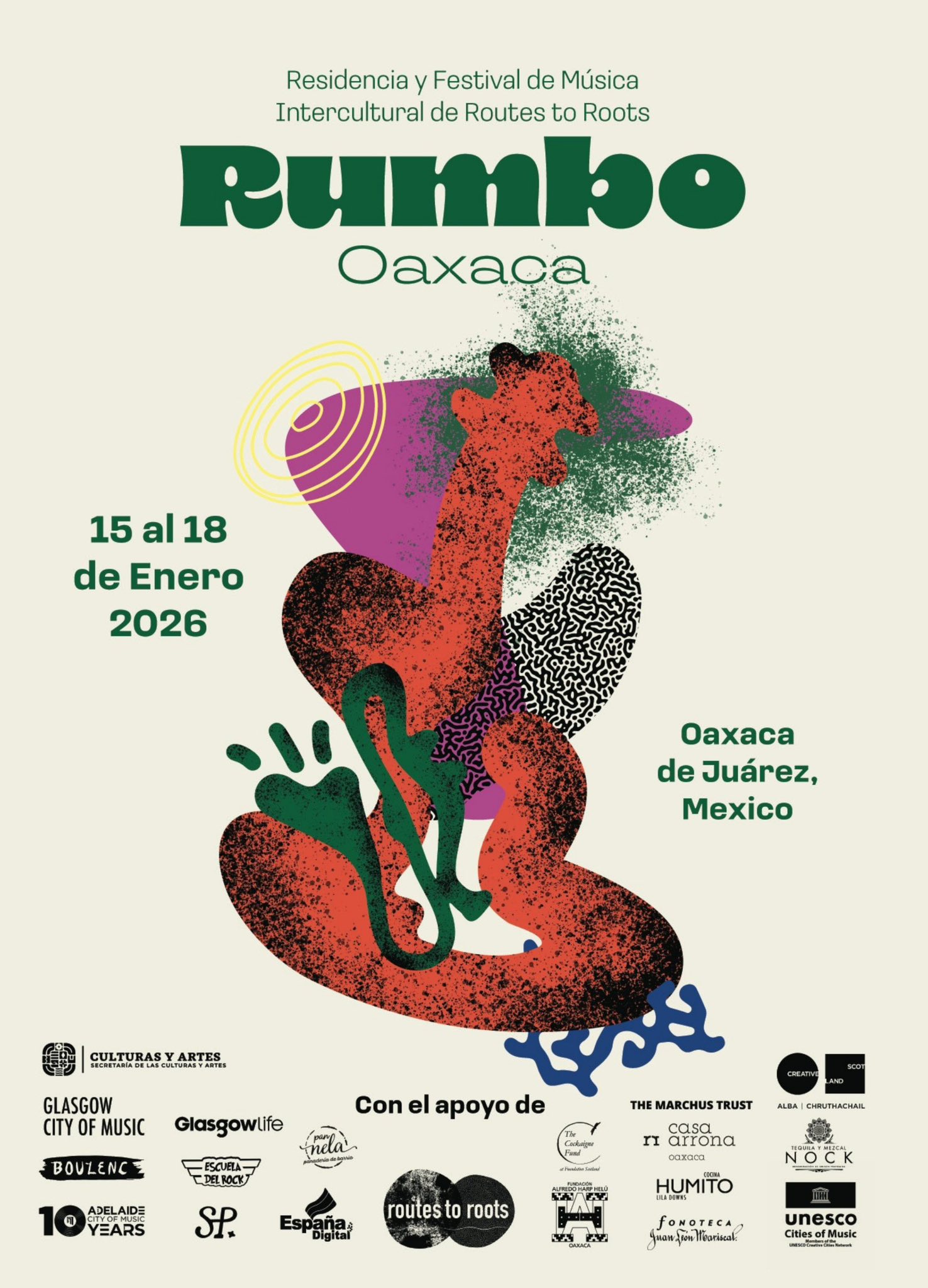 Oaxaca.-, Rumbo Oaxaca 2026, es el festival y residencia artística con perspectiva intercultural que tendrá como sede la ciudad de Oaxaca y el cual es el corazón del proyecto Routes to Roots (Rutas hacia las raíces), liderado por la destacada violinista y compositora escocesa Catriona Price.