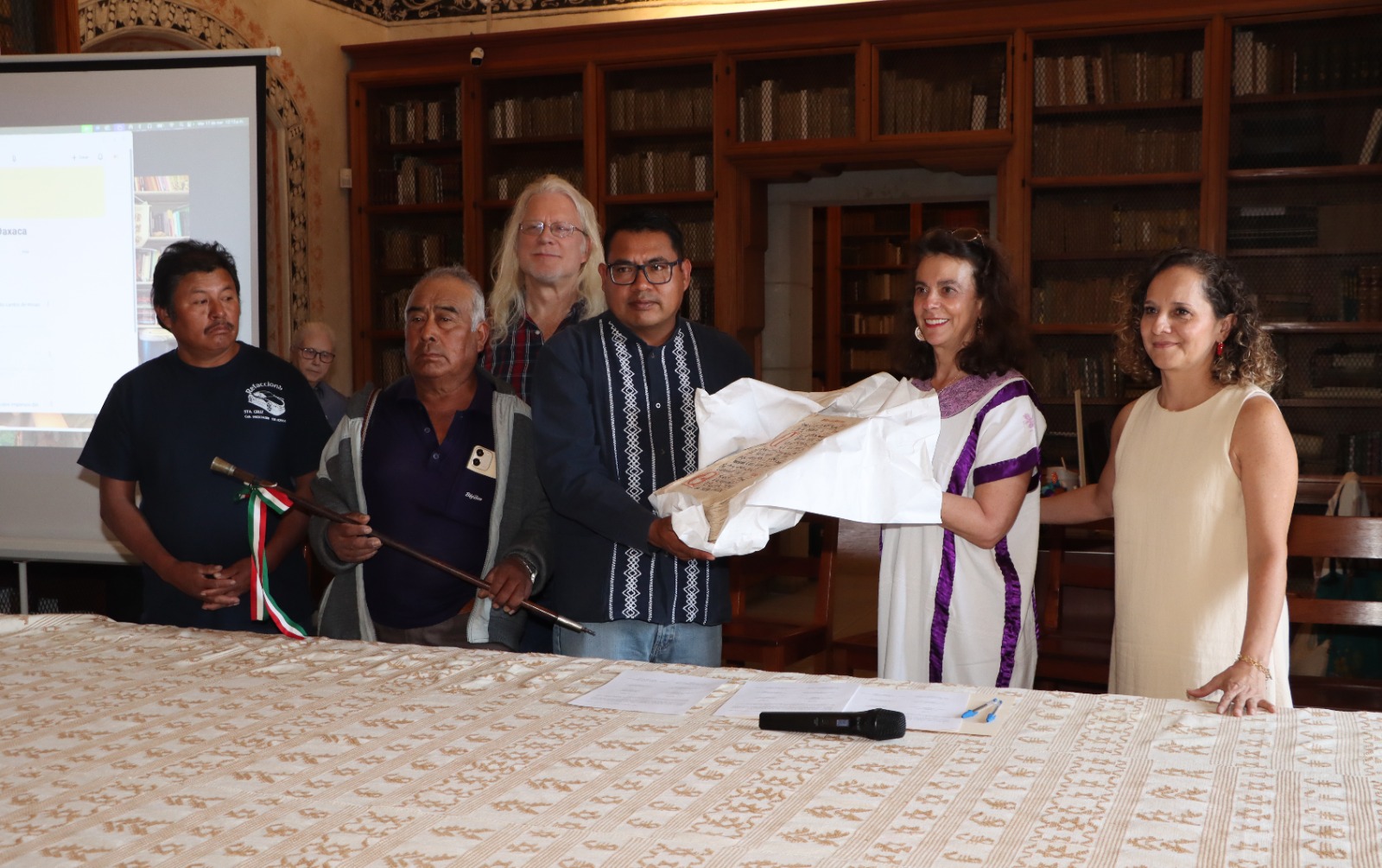 Cabe señalar que previo a este acto, personal de la Biblioteca de Investigación Juan de Córdova asesoró a la comunidad, invitándola a conocer el taller de restauración de la Biblioteca Fray Francisco de Burgoa para obtener el conocimiento informado para una decisión a nivel comunitario, ya que la salida de este tipo de materiales debe ser sometida a consenso.