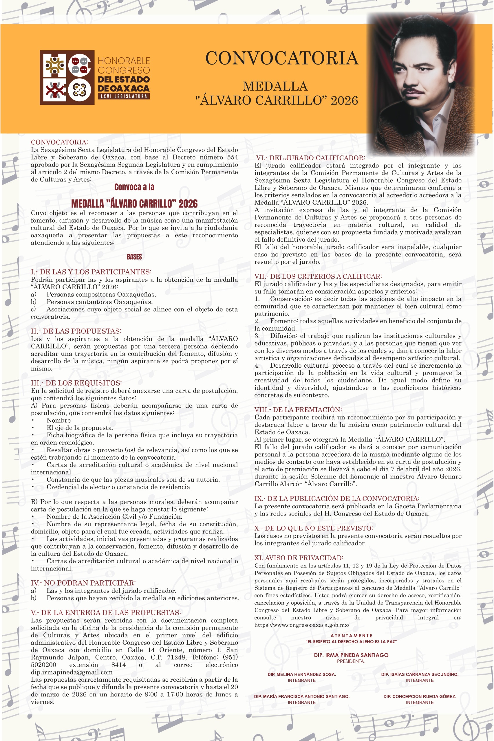 Oaxaca.- La LXVI Legislatura del Congreso del Estado emitió la convocatoria para participar en el proceso de postulación a la Medalla “Álvaro Carrillo” 2026, con el objetivo de reconocer a quienes, por su trayectoria y aportaciones, han fortalecido la música como una manifestación cultural de identidad y patrimonio del pueblo oaxaqueño.
