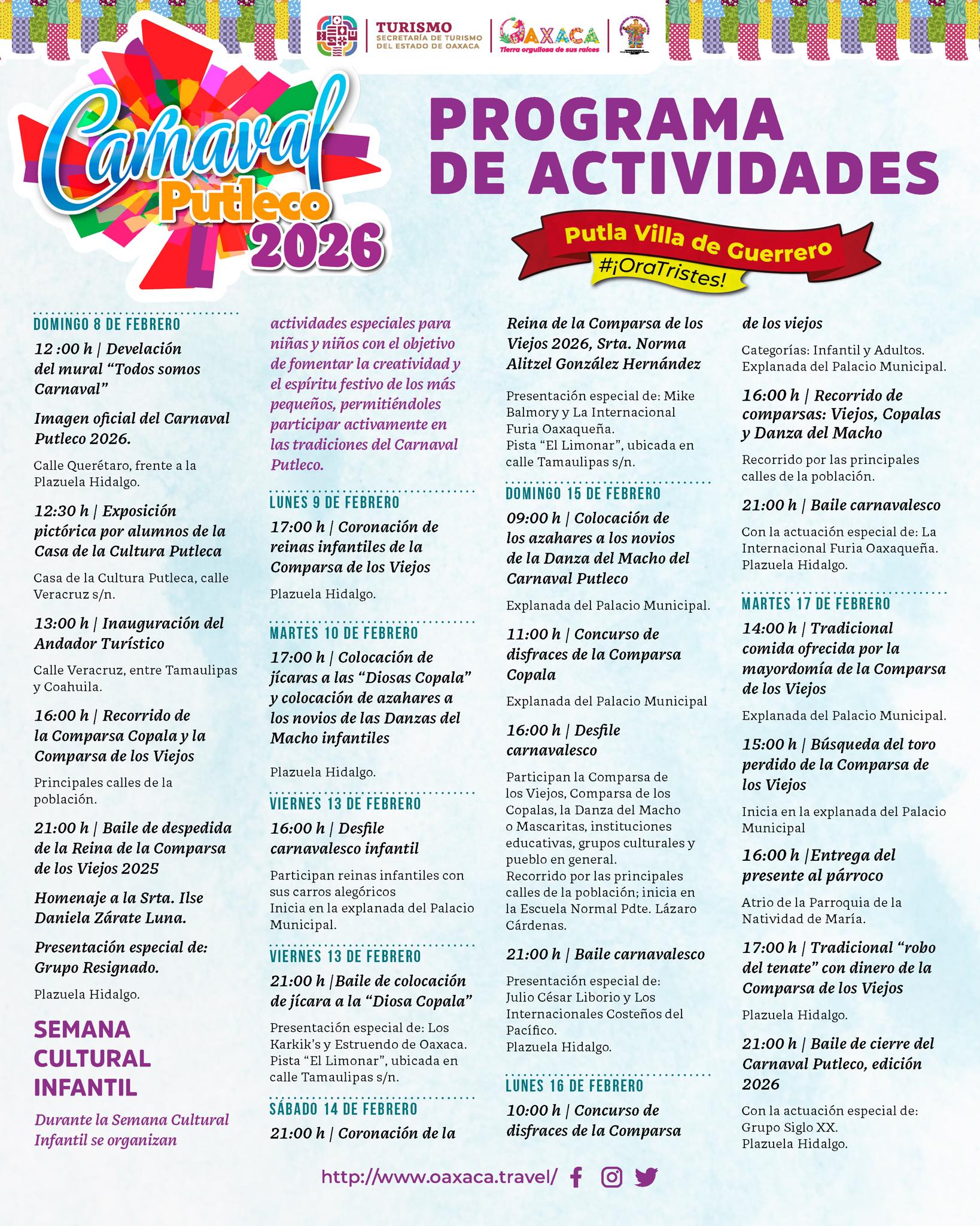 La subsecretaria de Operación Turística, Mariel López Villatoro señaló que por instrucción del Gobernador Salomón Jara Cruz se impulsa el fortalecimiento de festividades como el Carnaval Putleco, reconocido como Patrimonio Cultural Inmaterial del Estado, al contribuir a la identidad cultural y al desarrollo turístico.