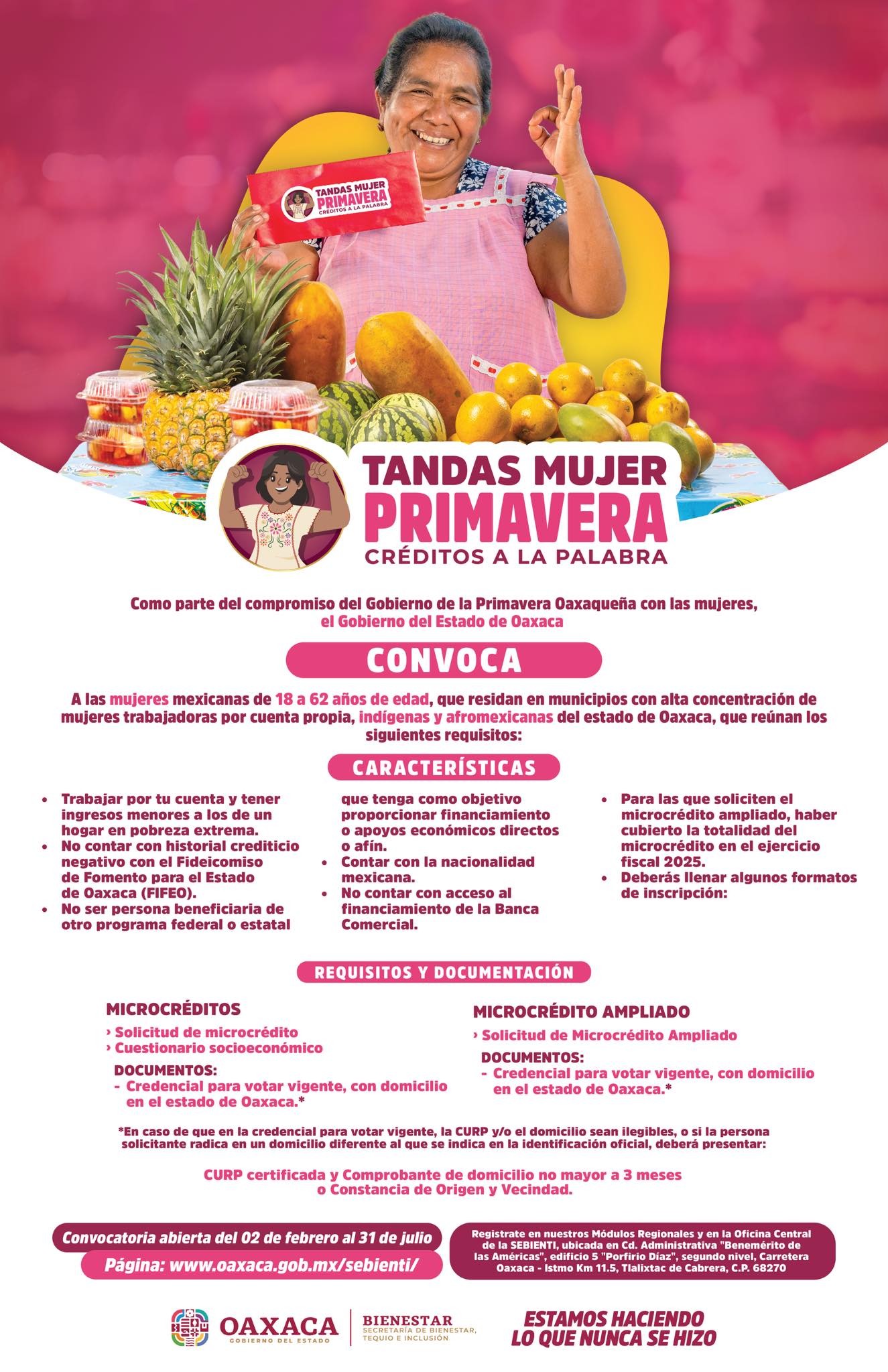 En lo que respecta a Tandas Mujer Primavera, la Secretaría de Bienestar, Tequio e Inclusión (Sebienti) confirmó que el presupuesto para este ejercicio fiscal se ha duplicado hasta alcanzar los 100 millones de pesos, con el objetivo de beneficiar a más de 17 mil mujeres de entre 18 y 62 años. El esquema de apoyos contempla un primer crédito de 5 mil pesos sin intereses a pagar en seis meses; no obstante, para este año se ha implementado un segundo nivel de financiamiento de hasta 10 mil pesos para aquellas beneficiarias que cumplieron puntualmente con sus pagos durante 2025. El registro para este programa permanecerá abierto desde el 2 de febrero hasta el 31 de julio, priorizando a mujeres que residan en el estado, trabajen por cuenta propia y no tengan acceso a la banca comercial.