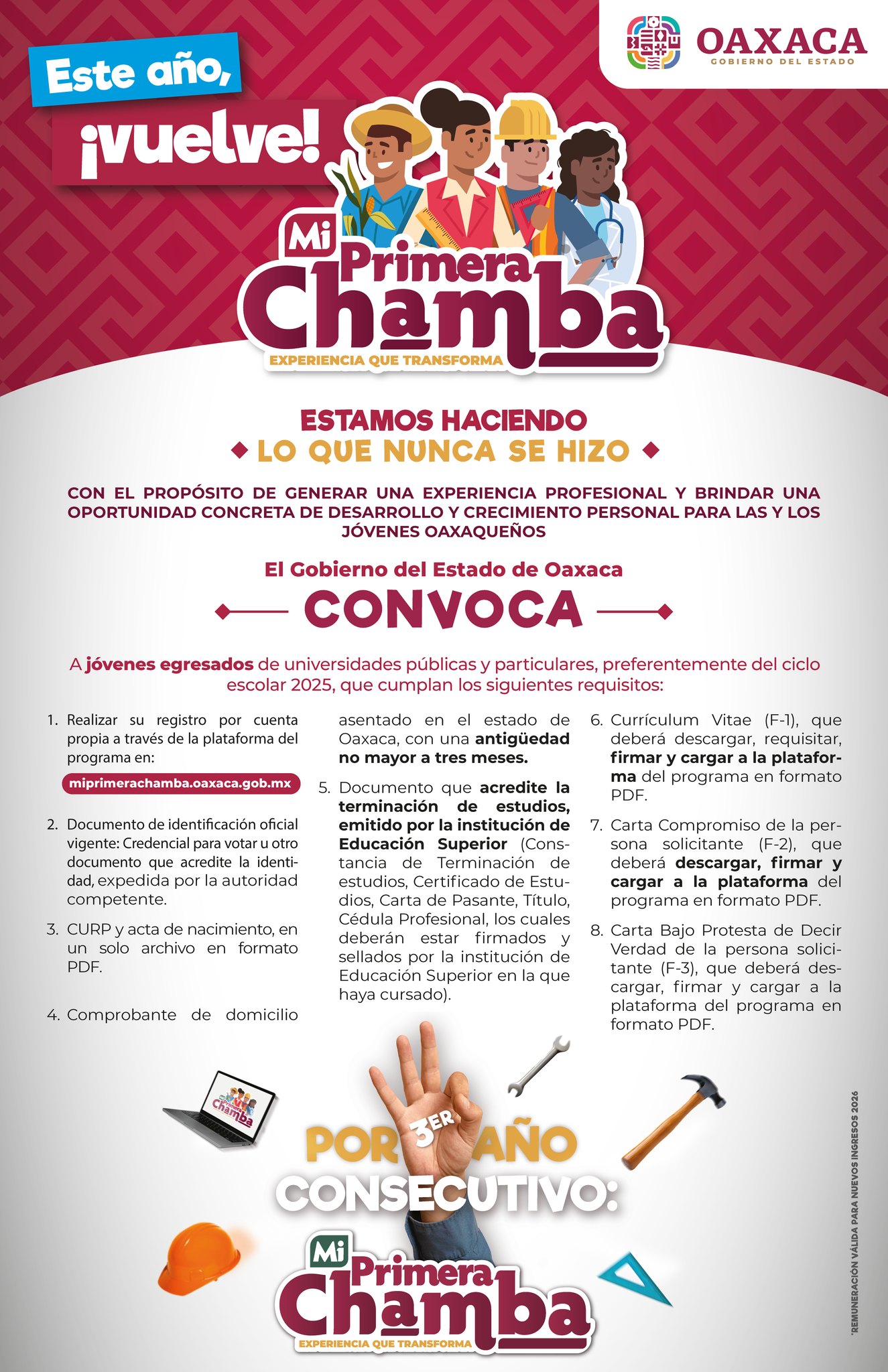 De manera complementaria, el programa Mi Primera Chamba, diseñado para facilitar la inserción laboral de recién egresados de nivel superior, operará en 2026 con una bolsa de 450 millones de pesos. Una de las actualizaciones más relevantes para este periodo es el aumento del incentivo mensual, el cual asciende de 8 mil 364 pesos otorgados el año pasado a 9 mil pesos mensuales durante el presente ciclo. Esta mejora busca garantizar que los jóvenes oaxaqueños cuenten con una remuneración digna mientras adquieren su primera experiencia profesional en sectores productivos del estado.