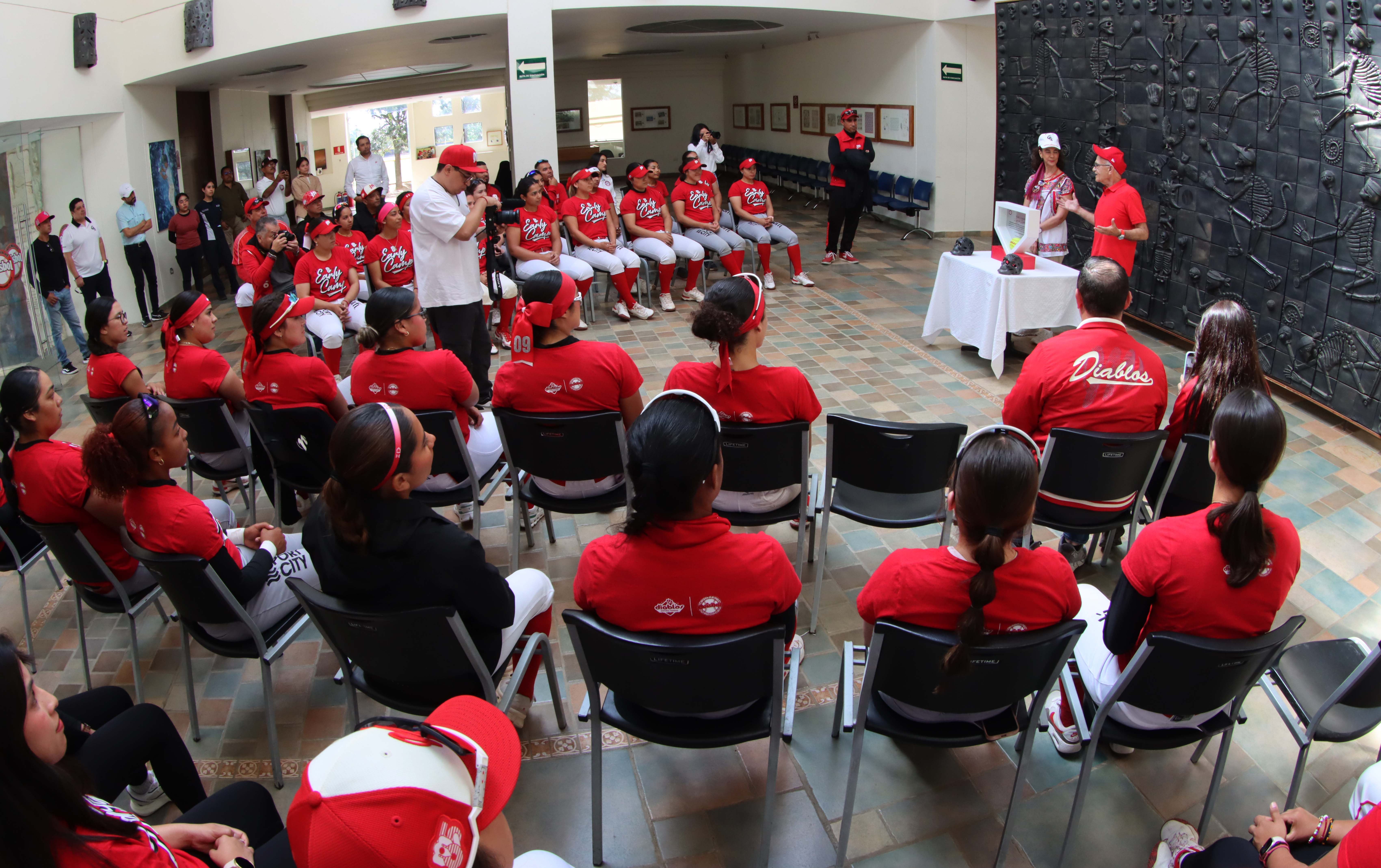Oaxaca.- El equipo de Diablos Rojos Femenil cumplió una semana de preparación en el Early Camp en Oaxaca y la jornada no solo contó con actividad dentro del diamante sino también se dio la visita del CP Alfredo Harp Helú y de la Dra. María Isabel Grañén, quienes además de dedicarle un mensaje a las jugadoras y al staff de coacheo de la escuadra, también presentaron una placa con la que queda registrado que la Academia de Beisbol Alfredo Harp Helú recibió por primera vez al conjunto de softbol de la organización.