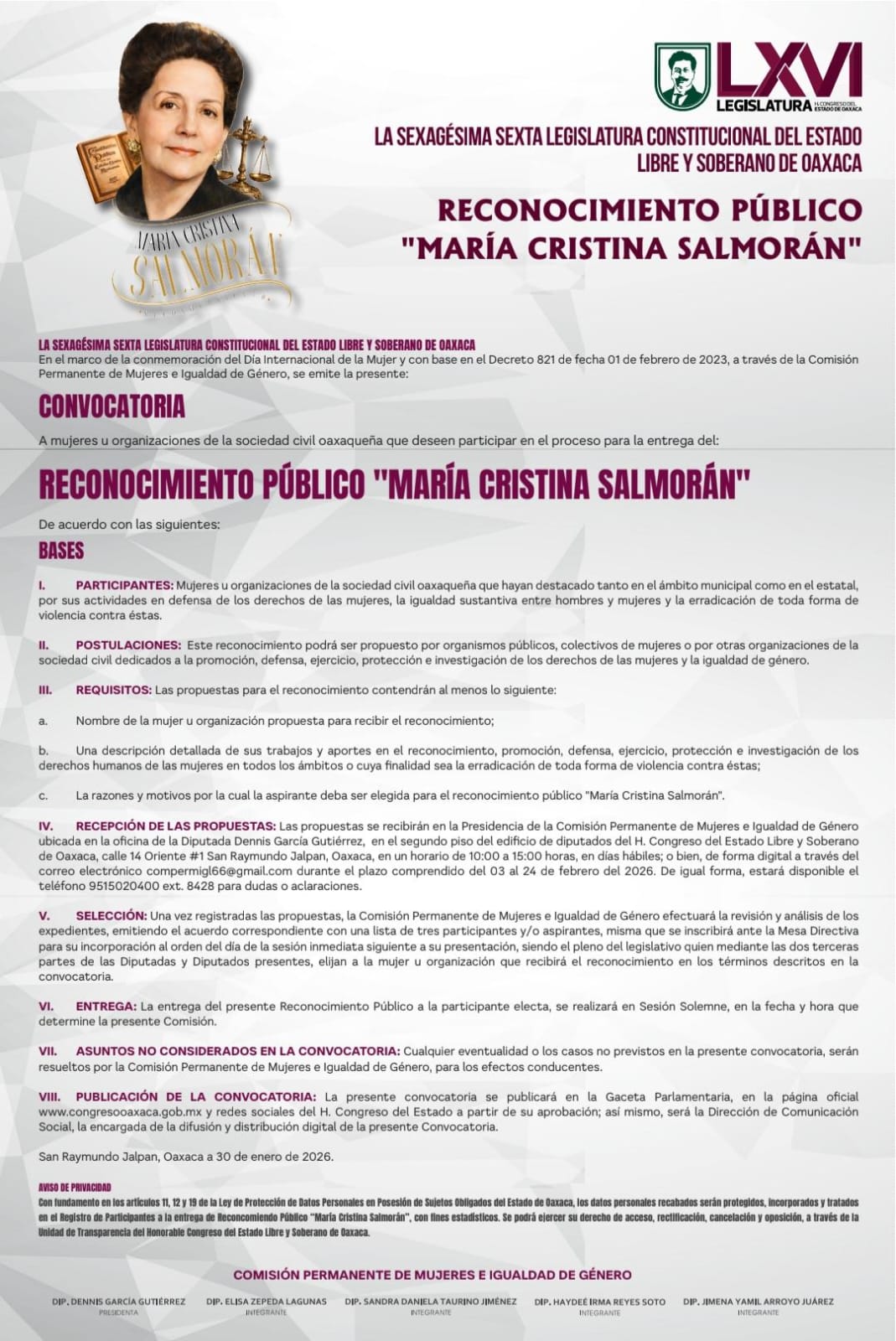 Oaxaca.- La LXVI Legislatura del Congreso de Oaxaca emitió la convocatoria para participar en el proceso para la entrega del Reconocimiento Público “María Cristina Salmorán” 2026, en el marco de la conmemoración del Día Internacional de la Mujer.