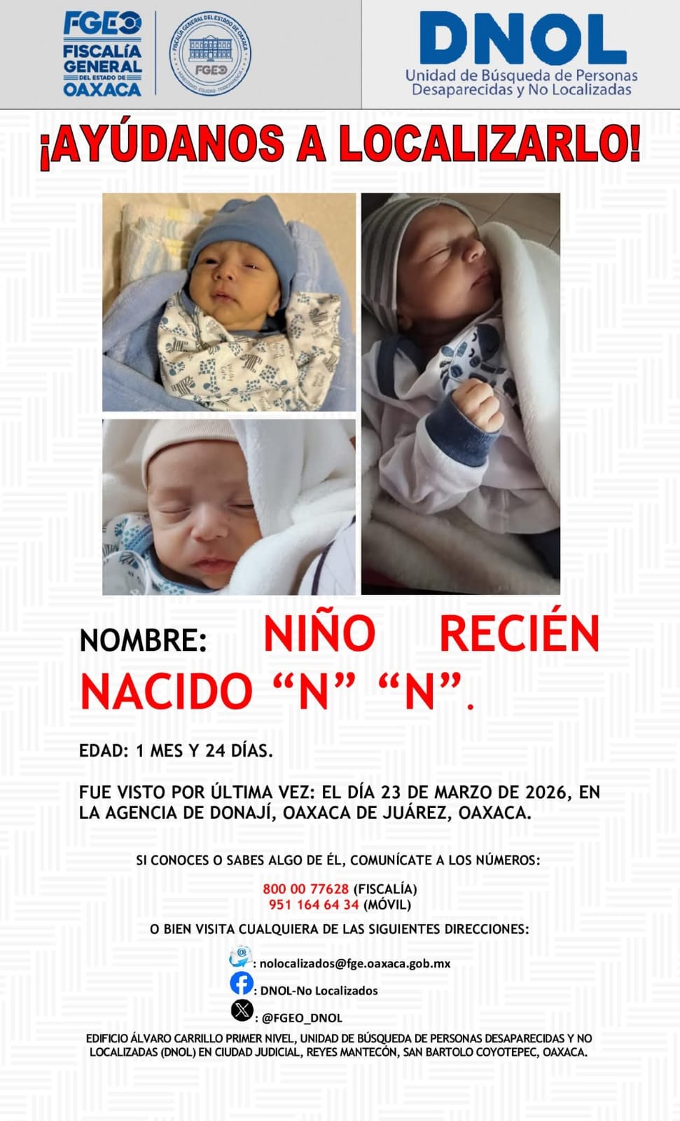 Oaxaca.- Tras recibir la denuncia formal por la ausencia del recién nacido identificado con las iniciales “N” “N”, la Fiscalía General del Estado de Oaxaca (FGEO) activó de manera inmediata los protocolos de búsqueda y localización, así como la emisión de una Alerta Amber para garantizar el pronto paradero del menor de edad.