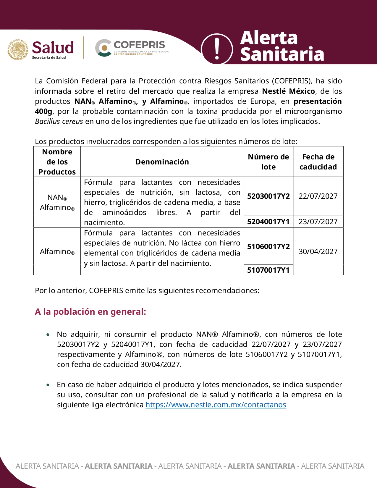 Ciudad de México.- La Comisión Federal para la Protección contra Riesgos Sanitarios (COFEPRIS), ha sido informada sobre el retiro del mercado que realiza la empresa Nestlé México, de los productos NAN® Alfamino®, y Alfamino®, importados de Europa, en presentación 400g, por la probable contaminación con la toxina producida por el microorganismo Bacillus cereus en uno de los ingredientes que fue utilizado en los lotes implicados.