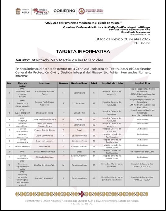 Ciudad de México.-La Fiscalía General de Justicia del Estado de México confirmó que el tiroteo ocurrido este lunes a las 12:00 horas en la Pirámide de la Luna, dentro de la zona arqueológica de Teotihuacán, dejó como saldo una turista canadiense fallecida, trece personas lesionadas —entre ellas un niño colombiano de seis años— y el presunto agresor muerto por aparente suicidio.