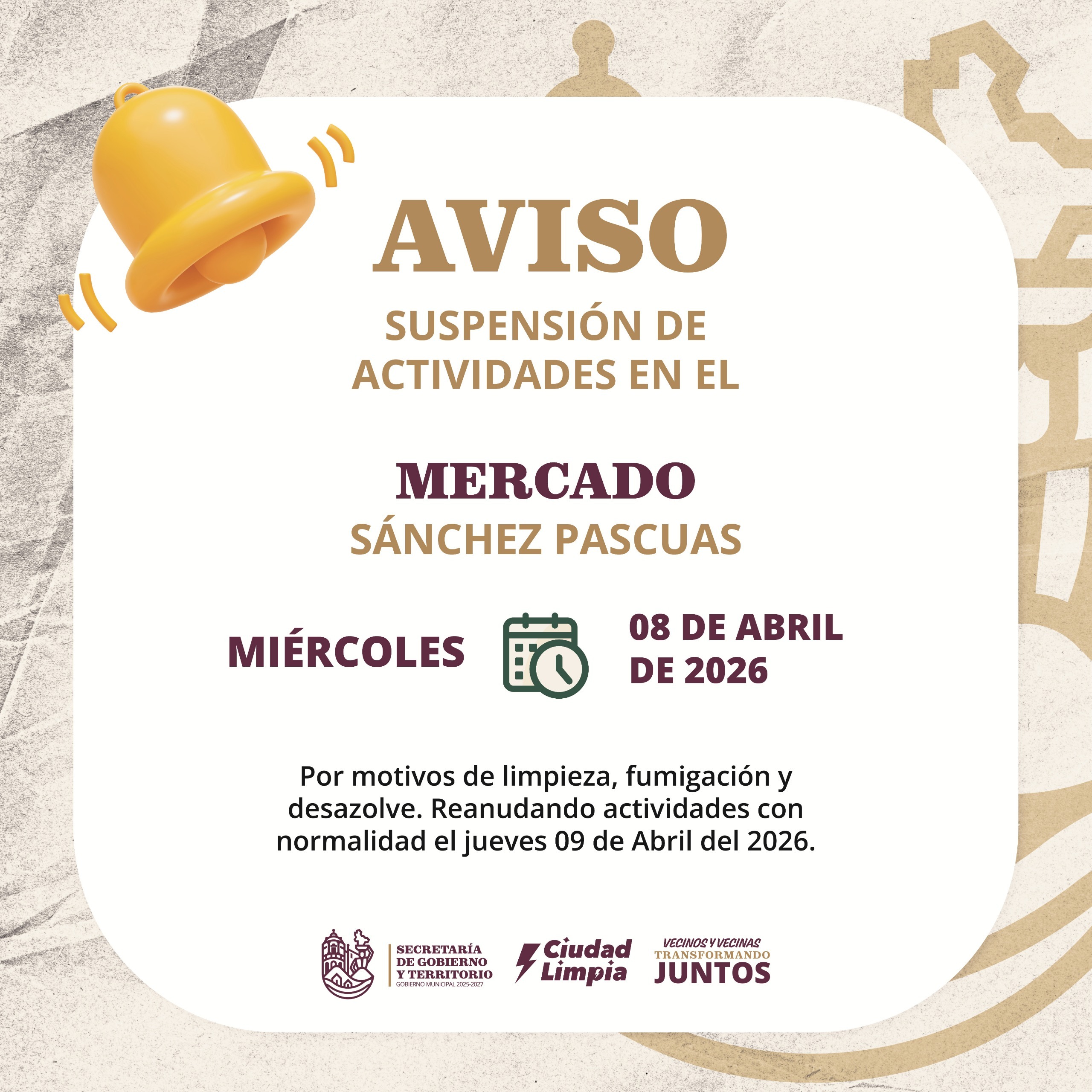 Se informa que las actividades se reanudarán de manera normal el jueves 09 de abril de 2026, por lo que se solicita la comprensión y colaboración de la ciudadanía ante estas labores que contribuyen a mantener espacios dignos y seguros para todas y todos.