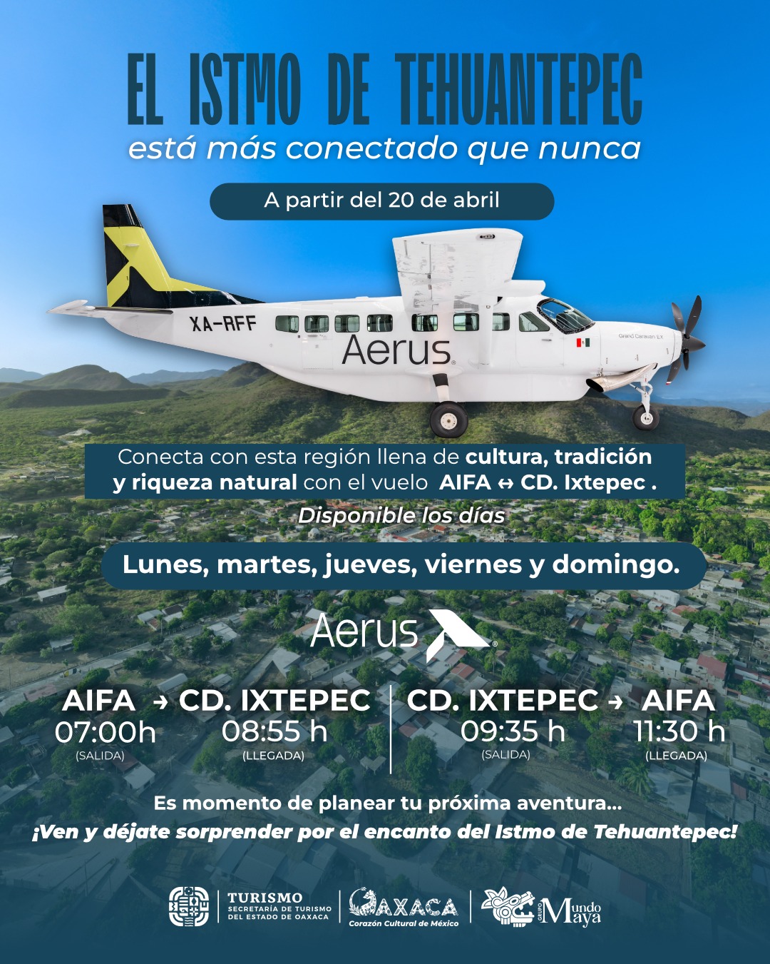 Oaxaca.- La Secretaria de Turismo, Saymi Pineda Velasco, anunció formalmente la expansión de la red aeroportuaria del estado mediante una alianza estratégica con la aerolínea Aerus, la cual inaugurará la ruta que conectará al Aeropuerto Internacional Felipe Ángeles con la terminal de Ciudad Ixtepec a partir del próximo lunes 20 de abril.