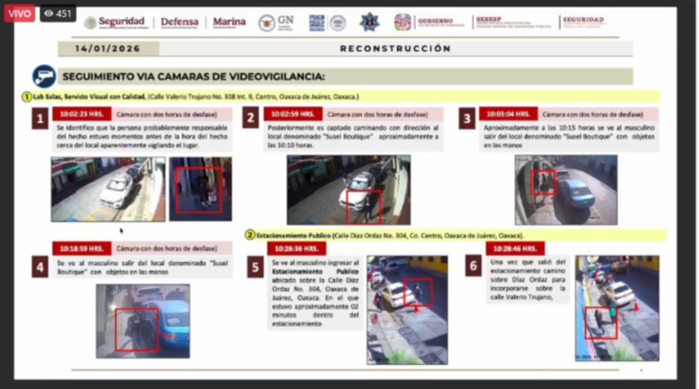 Los trabajos de inteligencia, indicó demuestran que el sujeto llegó a la zona con el propósito premeditado de cometer actos delictivos. Gracias al análisis de diversas cámaras de seguridad de establecimientos comerciales y restaurantes, se logró documentar que el sospechoso se encontraba frente a la boutique desde las 10:02 horas, ingresando un minuto después y saliendo del lugar a las 10:18 horas tras cometer la agresión.