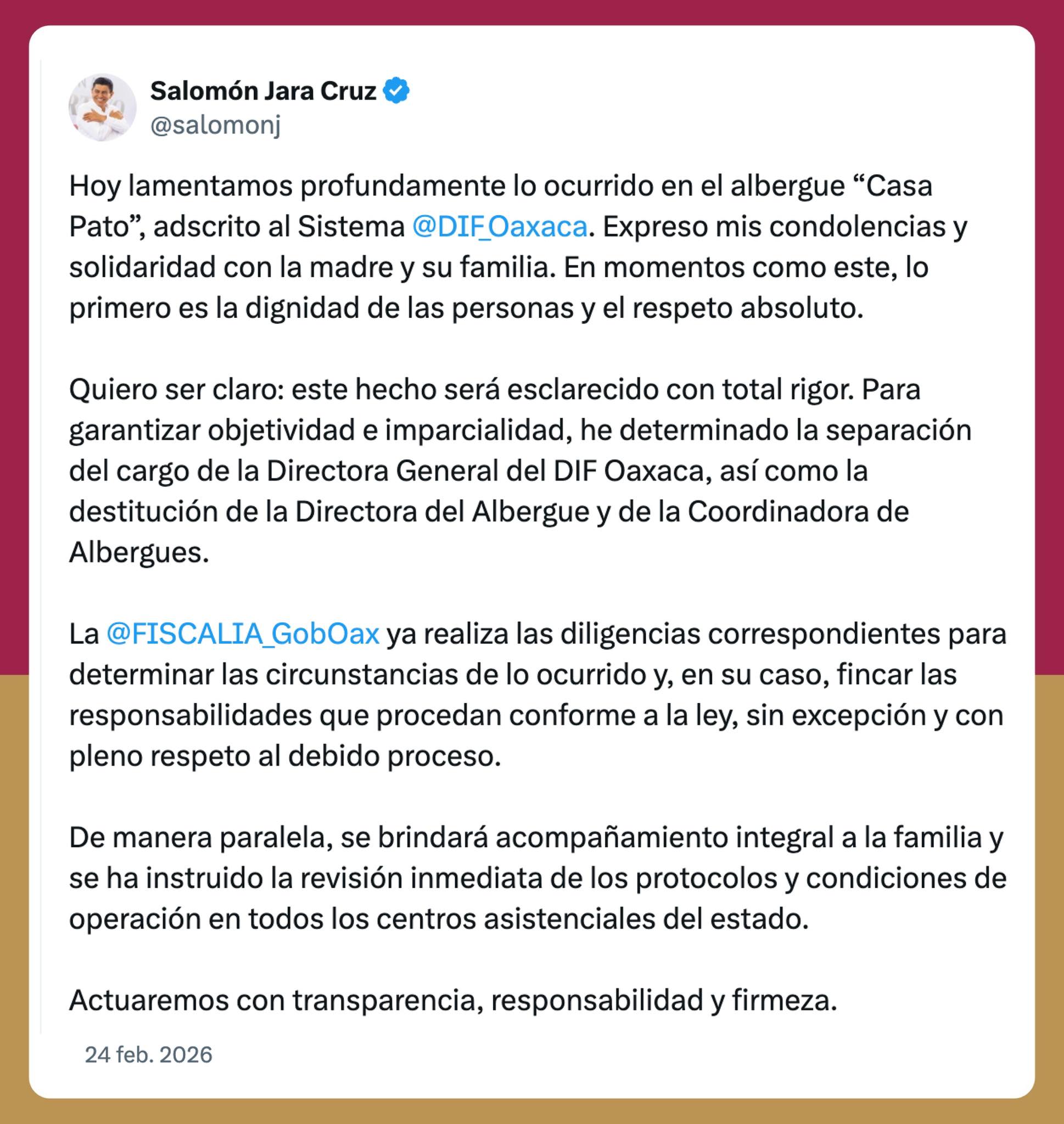 Oaxaca.- El deceso de dos niñas de origen haitiano dentro de las instalaciones del albergue Casa del Sistema DIF Estatal de Oaxaca, provocó que se registrara la destitución de funcionarias y se inciará una carpeta de investigación, así lo anunció el Gobernador Salomón Jara Cruz en sus redes sociales.