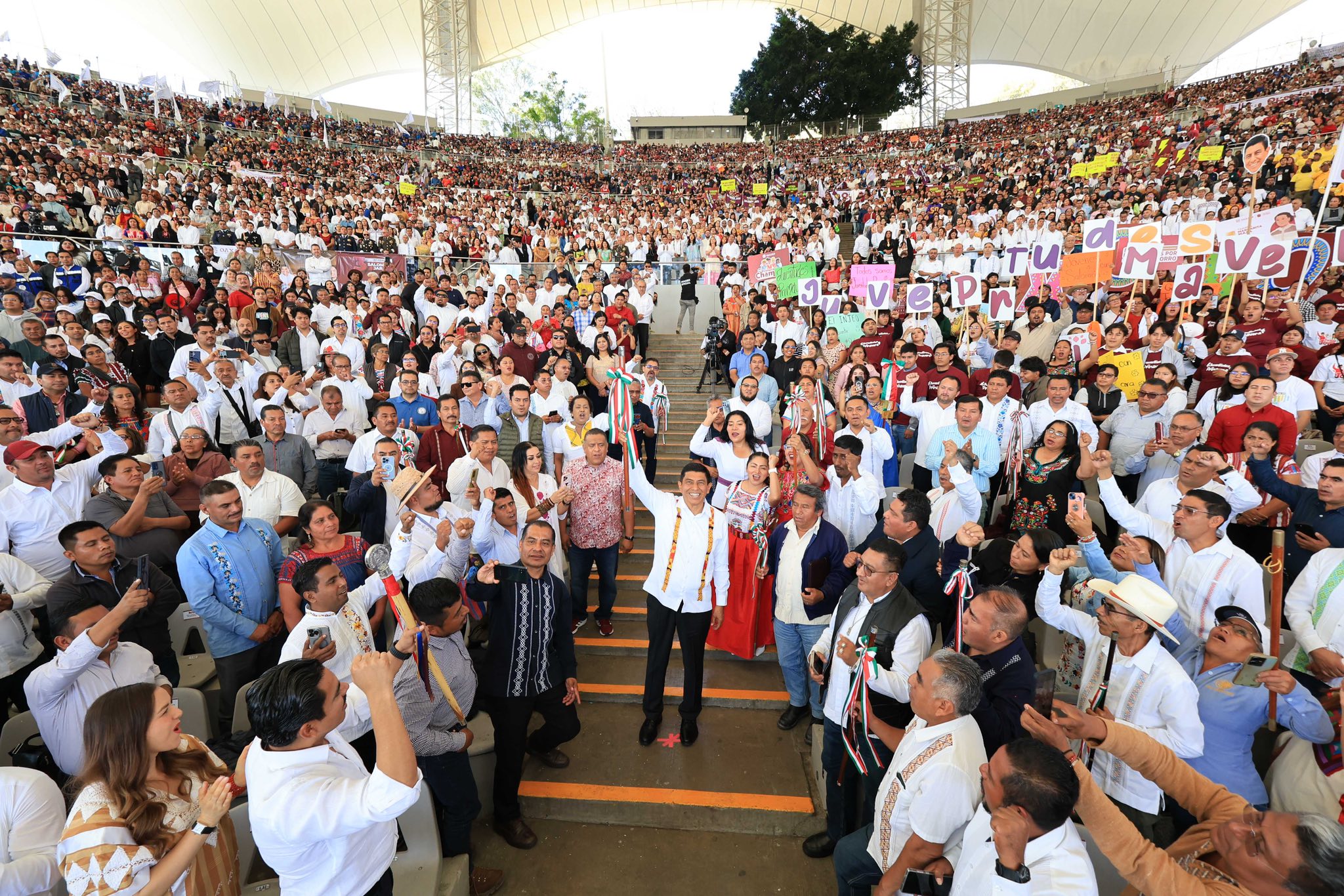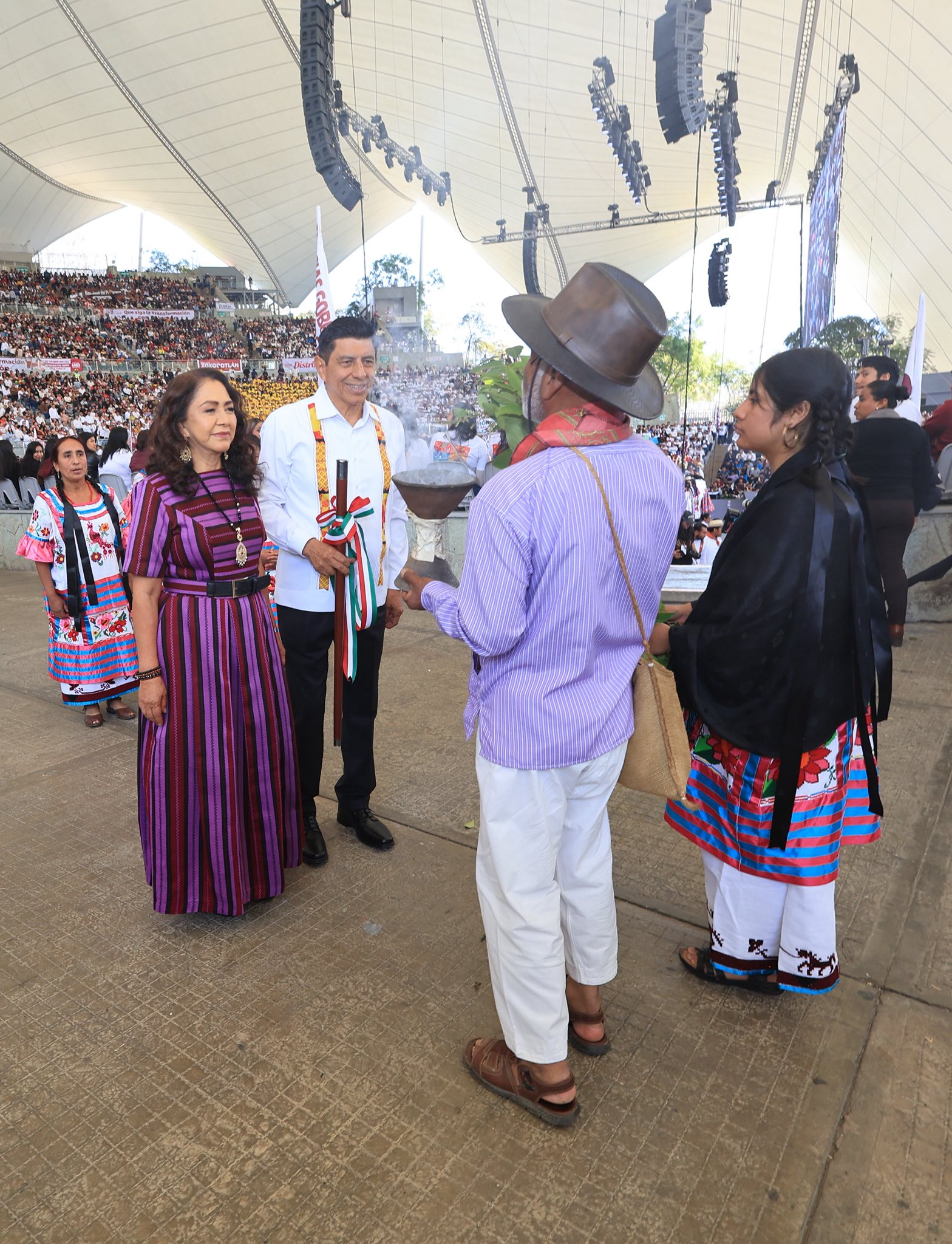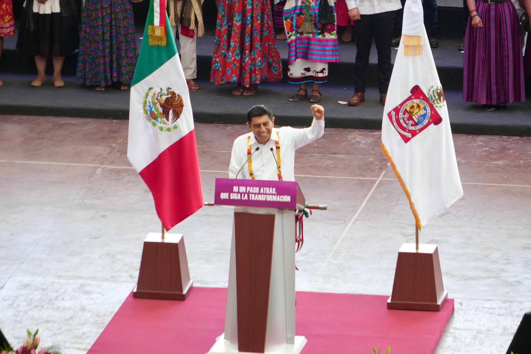 Acompañado del secretario del Trabajo y Previsión Social de México, Marath Baruch Bolaños López; y de los gobernadores de Chiapas, Puebla, Tabasco y Veracruz, Oscar Eduardo Ramírez Aguilar, Alejandro Armenta Mier, Javier May Rodríguez y Norma Rocío Nahle García; Jara Cruz expuso que su gobierno reivindica la identidad y diversidad cultural de Oaxaca.