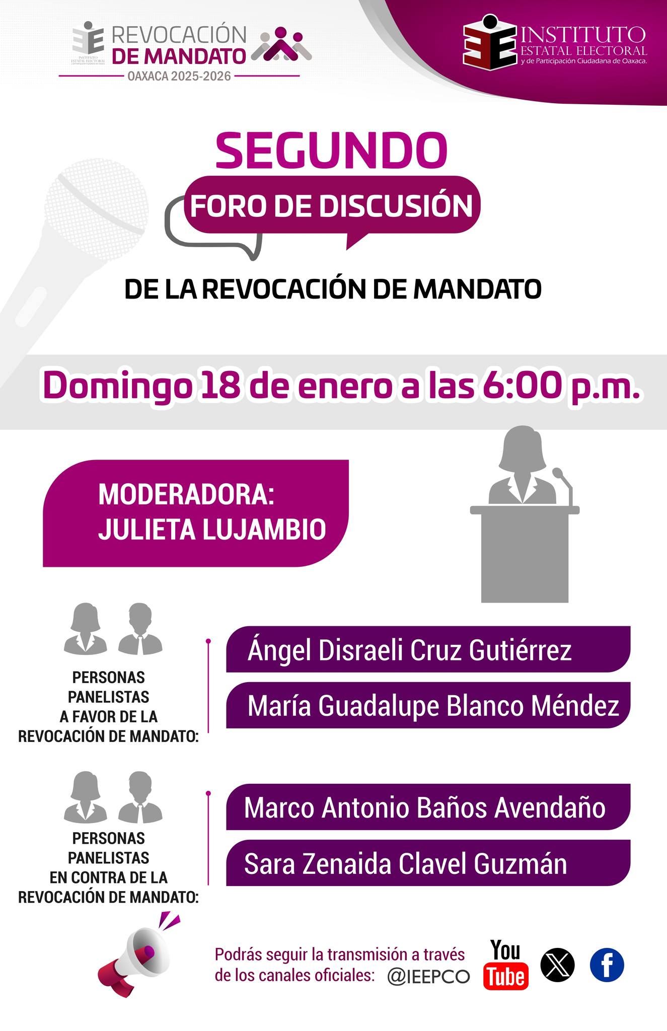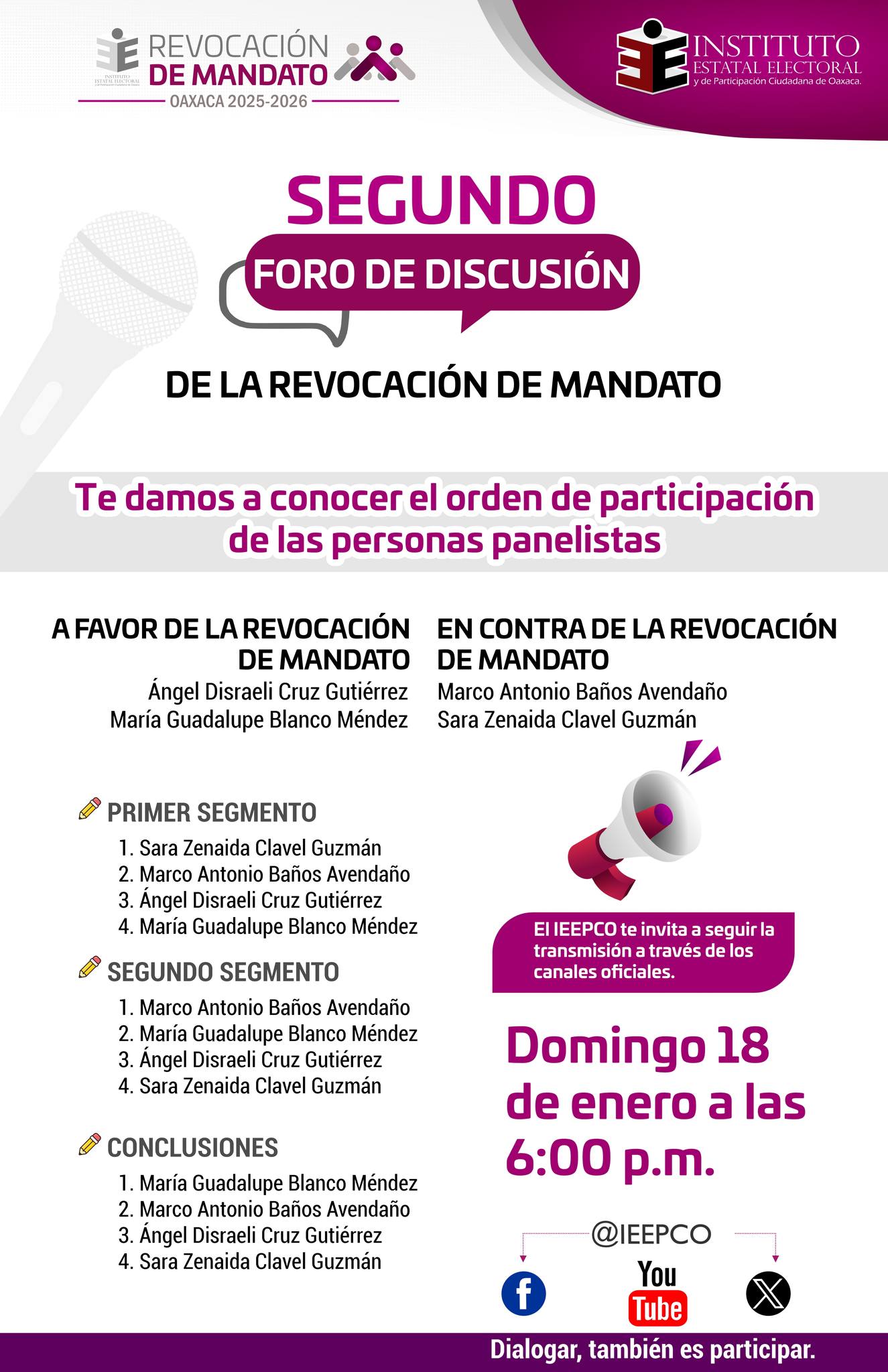 El foro se desarrollará en dos segmentos de preguntas y respuestas, así como en un espacio adicional destinado a la presentación de conclusiones, en relación con la Revocación de Mandato de la persona titular de la Gubernatura del Estado de Oaxaca para el periodo constitucional 2022–2028, cuya jornada se llevará a cabo el domingo 25 de enero.