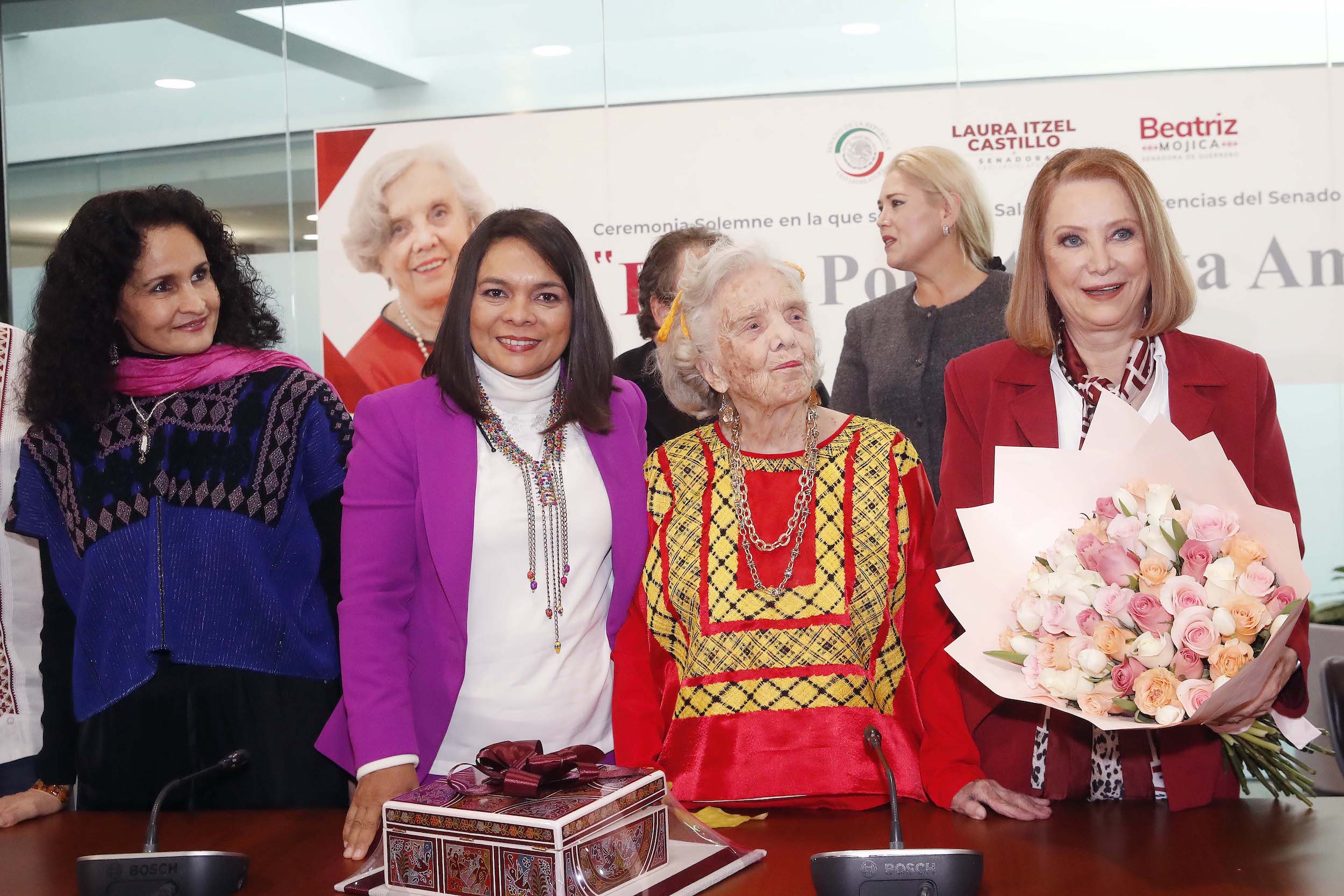 Beatriz Mojica Morga, presidenta de la Comisión de Cultura, coincidió en que las obras de Elena Poniatowska “no son sólo libros, son ventanas hacia vidas que gracias a su pluma quedaron en la memoria colectiva”.