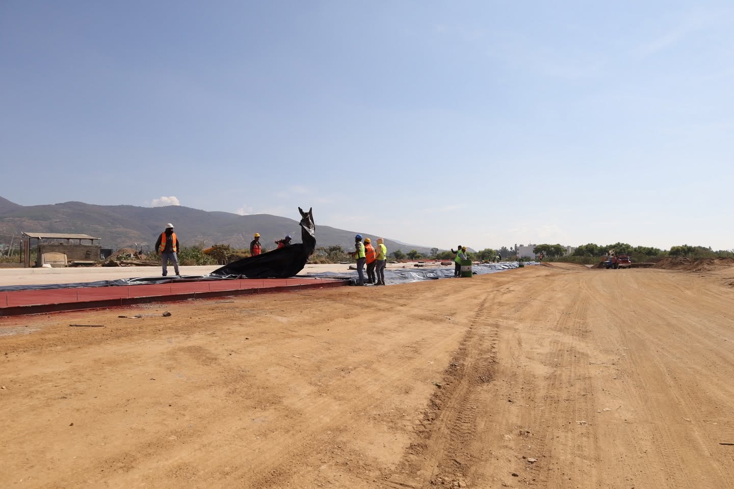 Oaxaca.- La Secretaría de Infraestructura y Comunicaciones (SIC) lleva a cabo el colado de la superficie de rodamiento de la ciclovía, que forma parte de la carretera que conectará la zona de la Ex Garita con el Aeropuerto Internacional Benito Juárez de Oaxaca, en Santa Cruz Xoxocotlán.